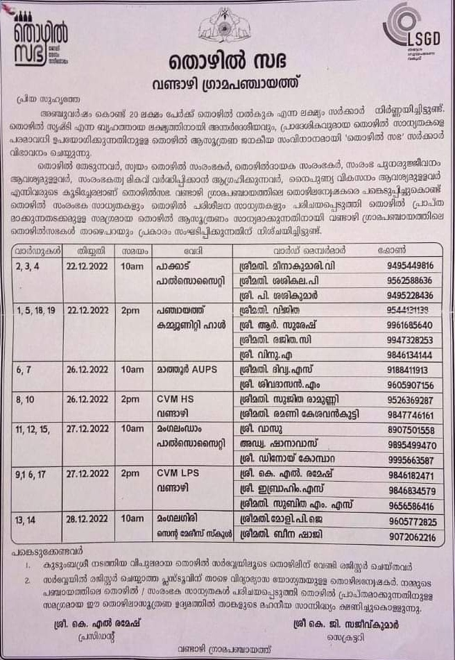 വണ്ടാഴി ഗ്രാമ പഞ്ചായത്തിൽ തൊഴിൽ സഭ സംഘടിപ്പിക്കുന്നു