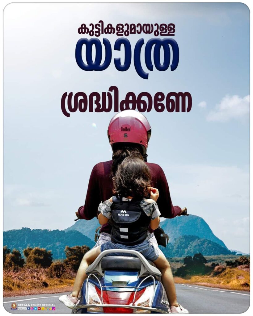 2019 -ൽ ഭേദഗതി ചെയ്യപ്പെട്ട നിലവിലുള്ള മോട്ടോർ വാഹന നിയമപ്രകാരം 4 വയസ്സിന് മുകളിൽ പ്രായമുള്ള ഏതൊരാളും ഇരുചക്ര വാഹനത്തിൽ സഞ്ചരിക്കുമ്പോൾ ഹെൽമെറ്റ് ധരിക്കണമെന്നാണ് നിയമം, എന്നാൽ നമ്മിൽ പലരും കുട്ടികൾക്കായി ഹെൽമെറ്റ് വാങ്ങുന്നതിൽ വിമുഖത കാണിക്കുന്നത് മൂലം നമ്മുടെ കുട്ടികളുടെ വിലപ്പെട്ട ജീവൻ പണയം വയ്ക്കുകയാണ്. കുട്ടികൾക്ക് ഇണങ്ങുന്ന ഹെൽമെറ്റ് നിർബന്ധമായും വാങ്ങുകയും ചെറുപ്പത്തിലേ തന്നെ ഹെൽമെറ്റും സീറ്റ് ബെൽറ്റും ധരിക്കുന്നത് പരിശീലിപ്പിക്കുകയും സ്വഭാവത്തിന്റെ ഭാഗമാക്കി മാറ്റുകയും ചെയ്യുക. കാറിലാണെങ്കിൽ 14 വയസ്സിന് മുകളിലേക്ക് നിർബന്ധമായും സീറ്റ് ബെൽറ്റും അതിന് താഴെ പ്രായമുള്ള കുട്ടികൾക്ക് ശരീര വലിപ്പമനുസരിച്ച് സീറ്റ് ബെൽറ്റോ അല്ലെങ്കിൽ ചൈൽഡ് റീസ്ട്രെയിന്റ് സിസ്റ്റമൊ ഉപയോഗിക്കുക. സ്വന്തം ശരീരത്തിനും സ്റ്റിയറിംഗിനും ഇടക്ക് കുഞ്ഞുങ്ങളെ ഇരുത്തുന്ന അത്യന്തം അപകടം നിറഞ്ഞ പ്രവർത്തി ഒഴിവാക്കുക. കഴിയുന്നതും കുട്ടികളെ പുറകിലെ സീറ്റിൽ ഇരുത്തുക, മടിയിൽ ഇരുത്തിക്കൊണ്ട് യാത്ര കഴിയുന്നതും ഒഴിവാക്കണം മുൻ സീറ്റിൽ പ്രത്യേകിച്ചും. കുട്ടികൾ ഉള്ളപ്പോൾ ചൈൽഡ് ലോക്ക് നിർബന്ധമായും ഉപയോഗിക്കുക. ഡോർ തുറക്കുന്നതിന് ഡച്ച് റീച്ച് രീതി (വലത് കൈ കൊണ്ട് ഇടത് ഡോർ തുറക്കുന്ന രീതി) പരിശീലിപ്പിക്കുന്നത് ഉചിതമായിരിക്കും . വാഹനം നിർത്തിയിടുമ്പോൾ എൻജിൻ ഓഫ് ആക്കുന്നതും ഹാന്റ് ബ്രേക്ക് ഇടുന്നതും ശീലമാക്കുക. ഇതുമൂലം കുട്ടികൾ ആക്സിലറേറ്ററിൽ അറിയാതെ തിരിച്ചും ഗിയർ നോബ് മാറ്റിയും ഉണ്ടാകുന്ന അപകടങ്ങളെ തടയാം. 18 വയസ്സിൽ താഴെയുള്ള കുട്ടികളെക്കൊണ്ട് വാഹനം ഓടിപ്പിക്കുകയൊ അതിനുള്ള ശ്രമം ജനിപ്പിക്കുന്നതൊ ആയ ഒരു കാര്യവും പ്രോത്സാഹിപ്പിക്കരുത്. നിലവിലെ മോട്ടോർ വാഹന നിയമത്തിൽ ഏറ്റവും കഠിനമായ ശിക്ഷാവിധികൾ പ്രായപൂർത്തിയായാത്ത കുട്ടികൾ വാഹനം ഓടിക്കുന്നതിനാണെന്ന് അറിയണം. 2019 -ൽ പുതുതായി 199(A) വകുപ്പ് കൂട്ടി ചേർക്കുക വഴി ജുവനൈൽ ആയ കുട്ടികൾ വാഹനം ഓടിക്കുന്നത് ഇപ്പോൾ 35000 രൂപ പിഴയും രക്ഷിതാവിന് മൂന്ന് വർഷം വരെ ജയിൽ ശിക്ഷയും കിട്ടാവുന്ന കുറ്റമായി മാറ്റപ്പെട്ടിരിക്കുന്നു. മാത്രവുമല്ല വാഹനത്തിന്റെ രജിസ്ട്രേഷനും രക്ഷിതാവിന്റെ ലൈസൻസും റദ്ദു ചെയ്യപ്പെടാം. ആ കുട്ടിക്ക് 25 വയസ്സിന് ശേഷം മാത്രമെ ലൈസൻസിന് അപേക്ഷിക്കാനും കഴിയൂ.