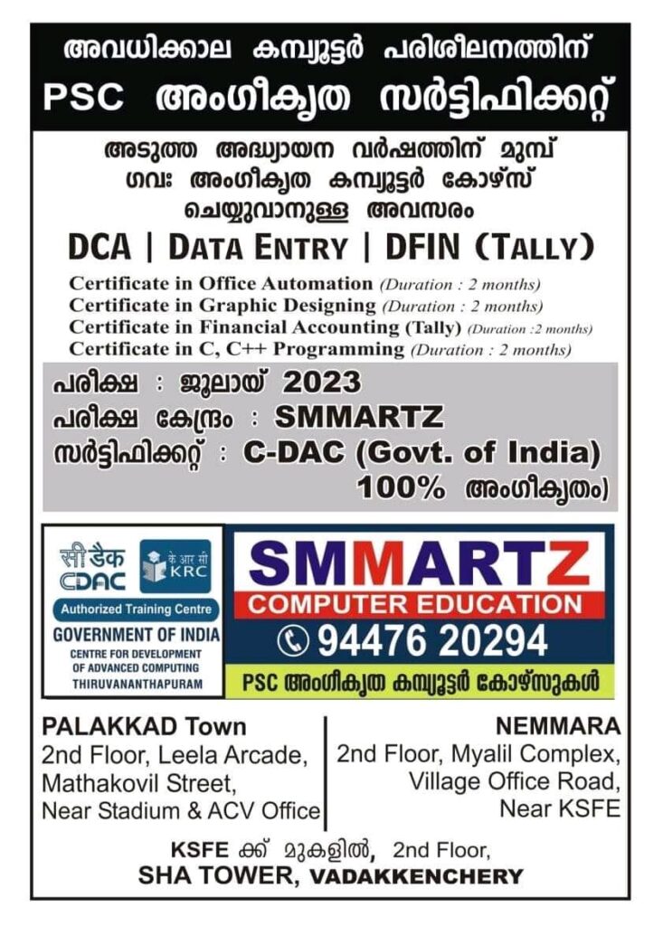 Psc അംഗീകൃത കോഴ്സുകൾ ആയ DCA, Data Entry, Tally (DFIN) കോഴ്സുകൾ ഈ അവധിക്കാലത്ത് CRASH Mode ൽ ചെയ്യാവുന്നതാണ്.