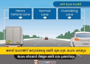 നാലുവരിപ്പാതയായാലും .ആറുവരിപ്പാതയായാലും ഏറ്റവും വലതു വശത്തെ വരി ഓവർ ടേക്കിംഗിനു മാത്രമോ ആമ്പുലൻസ് പോലുള്ള എമർജെൻസി വാഹനങ്ങൾക്ക് വേണ്ടി മാത്രമോ എപ്പോഴും ഒഴിച്ചിട്ട് ഇടതുവശത്തെ ട്രാക്കിലൂടെ മാത്രം വാഹനം ഓടിക്കുക.