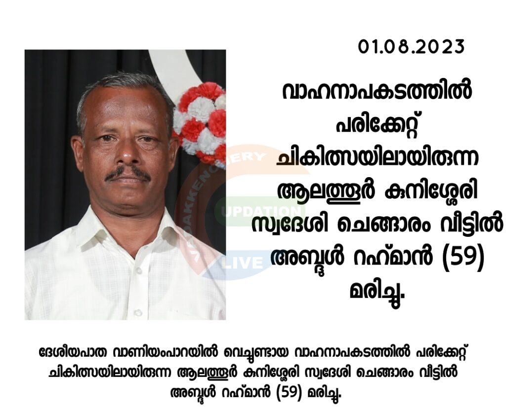 വാണിയംപാറ ദേശീയപാതയിൽ ഇന്നലെ മിനിലോറി മറിഞ്ഞുണ്ടായ അപകടത്തിൽ പരിക്കേറ്റ് ചികിത്സയിലായിരുന്ന ക ആലത്തൂർ കുനിശ്ശേരി സ്വദേശി കുഞ്ഞിറാവുത്തർ മകൻ ചെങ്ങാരം വീട്ടിൽ അബ്ദുൾ റഹിമാൻ (59) മരിച്ചു. വാണിയം പാറ സെന്ററിൽ വെച്ച് അബ്ദുൾ റഹിമാൻ സഞ്ചരിച്ച മിനിലോറി ഇടിച്ച് അപകടം ഉണ്ടായത്. ഉടൻ തന്നെ 108 ആംബുലൻസിൽ തൃശൂരുള്ള സ്വകാര്യ ആശുപത്രിയിൽ എത്തിച്ചു. ചികിത്സയിരിക്കെയാണ് മരിച്ചത് .
