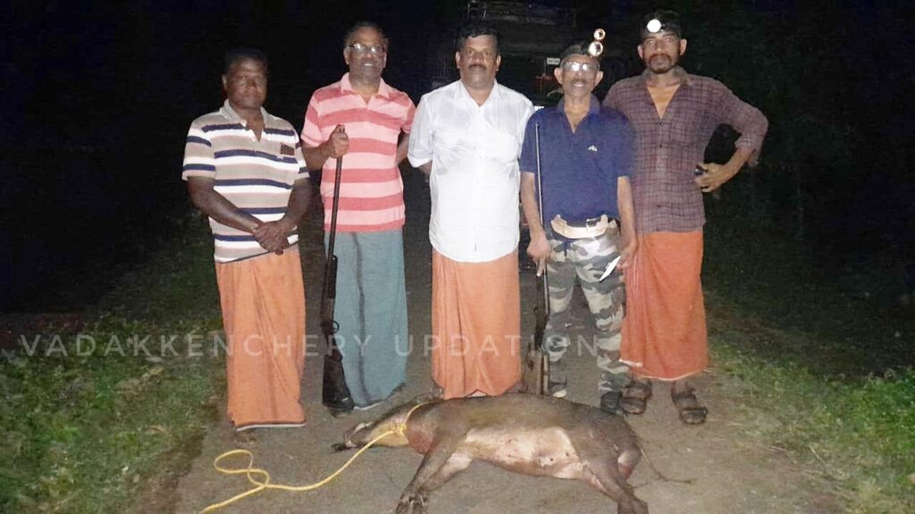 നെന്മാറ : നെന്മാറ പഞ്ചായത്തിലെ ആതവനാട് കണ്ണോട് കതിര് വന്ന നെൽപ്പാടത്ത് ഇറങ്ങിയ കാട്ടുപന്നിയെയാണ് വെടിവെച്ചു കൊന്നത്. കർഷകനായ ശ്രീകുമാറിന്റെ നെൽപ്പാടത്ത് ഇറങ്ങിയ കാട്ടുപന്നിക്കൂട്ടത്തിലെ ഒരു പന്നിയെയാണ് കഴിഞ്ഞ ദിവസം രാത്രി 10.30 പോടെ വെടിവെച്ചു കൊന്നത്. കൃഷിയിടത്തിന് കാവൽ ഇരുന്ന കർഷകർ കാട്ടുപന്നിക്കൂട്ടത്തിന്റെ സാന്നിധ്യം അറിഞ്ഞ് നെന്മാറ ഡി. എഫ്. ഒ. യുടെ പാനലിൽ പെട്ട ഷൂട്ടർമാരായ ശിവദാസ് പെരുമാങ്കോട്, വിജയൻ ചാത്തമംഗലം എന്നിവരെ വിവരമറിയിക്കുകയായിരുന്നു. ഷൂട്ടർമാരുടെയും കർഷകരുടെയും സാന്നിധ്യമറിഞ്ഞ കാട്ടുപന്നിക്കൂട്ടം നെൽപ്പാടത്ത് ഒളിച്ചു. ഏറെനേരത്തെ കാത്തിരിപ്പിനു ശേഷം പുറത്തുവന്ന ഒരു കാട്ടുപന്നിയെയാണ് വെടിവെച്ചു കൊല്ലാൻ കഴിഞ്ഞത്. 100 കിലോവിലേറെ ഭാരമുള്ള കാട്ടുപന്നിയെ കർഷകരുടെ സഹായത്തോടെ വനംവകുപ്പ് നിഷ്കർഷിച്ച രീതിയിൽ കുഴിച്ചുമൂടി. പഞ്ചായത്ത് അധികൃതരെ വിവരം അറിയിച്ചു.