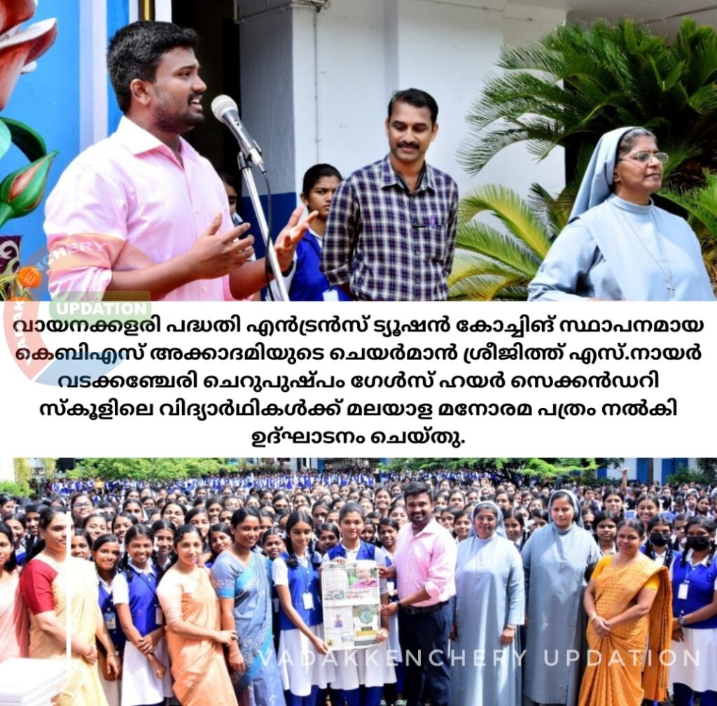 വടക്കഞ്ചേരി ചെറുപുഷ്പം ഗേൾസ് ഹയർ സെക്കൻഡറി സ്കൂളിലെ വായനക്കളരി പദ്ധതി എൻട്രൻസ് ട്യൂഷൻ കോച്ചിങ് സ്ഥാപനമായ കെബിഎസ് അക്കാദമിയുടെ ചെയർമാൻ ശ്രീജിത്ത് എസ്.നായർ വിദ്യാർഥി പ്രതിനിധികളായ എസ്.ദിൽഷ, ശ്രീലയ സുധീഷ് എന്നിവർക്കു മലയാള മനോരമ പത്രം നൽകി ഉദ്ഘാടനം ചെയ്തു. സ്കൂൾ പ്രിൻസിപ്പൽ സിസ്റ്റർ ആഗ്നൽ ഡേവിഡ്, ഹെഡ്മിസ്ട്രസ് സിസ്റ്റർ ശോഭ റോസ്, അധ്യാപകരായ ഷേർളി സെബാസ്റ്റ്യൻ, പി.ജെ.ജോമോൾ, ഡയാന ടി.ഇമ്മാനുവൽ, എസ്.ധനിഷ, ജിഷ പോൾ, സിസ്റ്റർ റിജിലിൻ എന്നിവരും പങ്കെടുത്തു എൻട്രൻസ് ട്യൂഷൻ പരിശീലന സ്ഥാപനമായ കെബിഎസ് അക്കാദമിയുടെ പാലക്കാട്, വടക്കഞ്ചേരി ബ്രാഞ്ചുകളുടെ ചെയർമാനായ ശ്രീജിത്ത് എസ്.നായരുടെ സഹകരണത്തോടെയാണ് സ്കൂളിൽ വായനക്കളരി പദ്ധതി നടപ്പിലാക്കുന്നത്