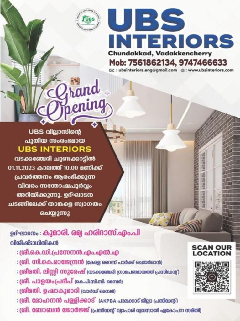 വടക്കഞ്ചേരി ചുണ്ടക്കാട്ടിൽ UBS വില്ലാസിന്റെ പുതിയ സംരംഭമായ UBS INTERIORS ഉദ്ഘാടനം ചെയ്തു