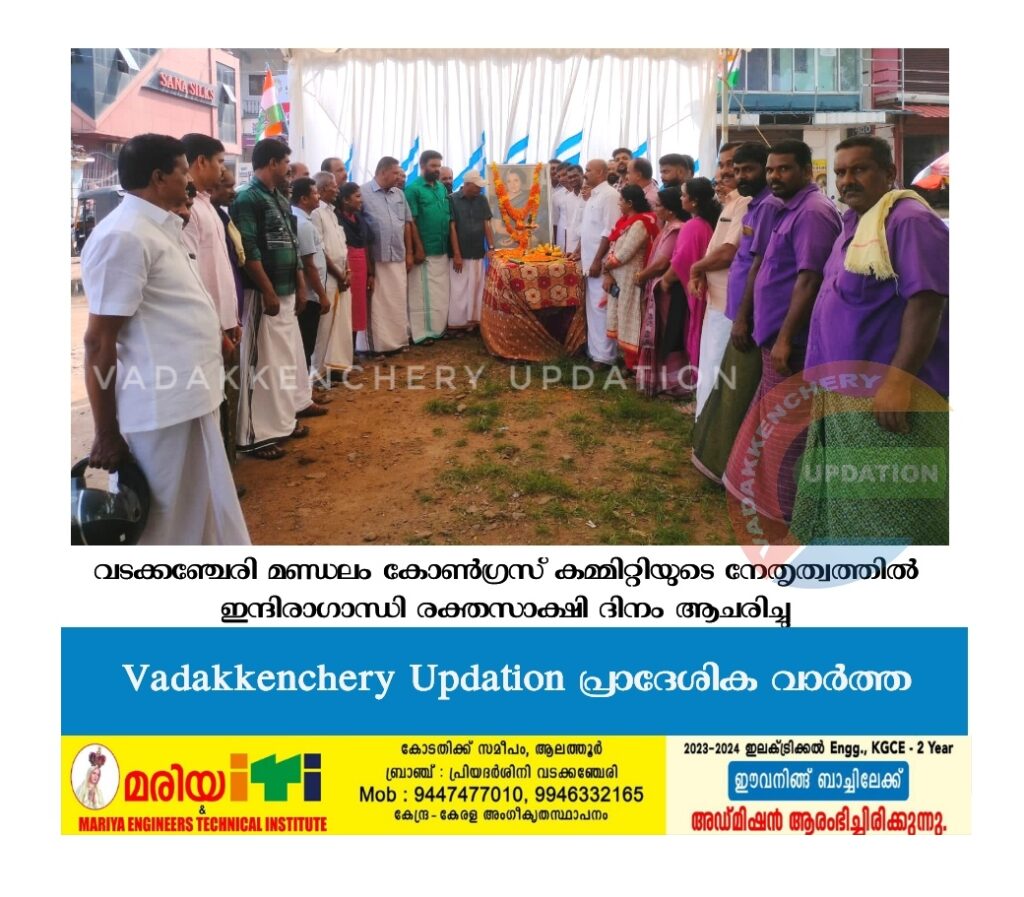വടക്കഞ്ചേരി മണ്ഡലം കോൺഗ്രസ് കമ്മിറ്റിയുടെ നേതൃത്വത്തിൽ ഇന്ദിരാഗാന്ധി രക്തസാക്ഷി അനുസ്മരണത്തോടനുബന്ധിച്ച് മന്ദമൈതാനിയിൽ രാവിലെ പുഷ്പാർച്ചനയും . വൈകുന്നേരം ഇന്ദിരാഗാന്ധി രക്തസാക്ഷി അനുസ്മരണവും ,