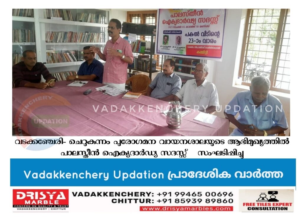 വടക്കഞ്ചേരി- ചെറുകുന്നം പുരോഗമന വായനശാലയുടെ ആഭിമുഖ്യത്തിൽ നടന്ന പാലസ്തീൻ ഐക്യദാർഡ്യ സദസ്സ് വി.രാധാകൃഷ്ണൻ കിഴക്കഞ്ചേരി ഗ്രാമ പഞ്ചായത്ത് വൈസ്പ്രസിഡണ്ട് ഉദ്ഘാടനം ചെയ്തു സി.സി ചന്ദ്രബോസ് , ലൈബ്രറി കൗൺസിൽ താലൂക്ക് ജോയിന്റ് സെക്രട്ടറി വിഷയത്തിൽ സംസാരിച്ചു സി.ടി. കൃഷ്ണൻ മുൻ എം എൽ എ അദ്ധ്യക്ഷത വഹിച്ച ചടങ്ങിൽ സി. എ കൃഷ്ണൻ വായനശാല സെക്രട്ടറി സ്വാഗതം പറഞ്ഞു വയോജന വേദി സെക്രട്ടറി എ നാരായണൻ അനുശോചന പ്രമേയം അവതരിപ്പിച്ചു വി.സുധി, പി.വി.ഉണ്ണികൃഷ്ണൻ എന്നിവർ സംസാരിച്ചു കലാസമിതി സെക്രട്ടറി വി കെ സുധീർ നന്ദി പറഞ്ഞു