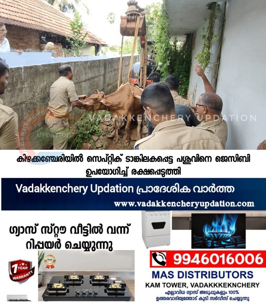 കിഴക്കഞ്ചേരി നെടുംപറമ്പത്ത് ക്ഷേത്രത്തിന് പിൻവശത്തെ സ്വകാര്യ വ്യക്തിയുടെ പണിതീരാത്ത വീടിനു സമീപമുള്ള സെപ്റ്റിക് ടാങ്കിൽ ആണ് ഗർഭിണിയായ പശു പെട്ടത്. ചൊവ്വാഴ്ച കാലത്ത് 8.30ഓടെയായിരുന്നു സംഭവം. കിഴക്കഞ്ചേരി മുണ്ടകശ്ശേരി നാരായണൻകുട്ടിയുടെ മേയാൻ വിട്ട പശുക്കളിൽ ഒന്ന് സ്ലാബ് തകർന്ന് അകത്തു പെടുകയായിരുന്നു. കാടുമൂടി കിടക്കുന്ന പ്രദേശമായതിനാൽ കുഴിയുള്ള ഭാഗം ശ്രദ്ധയിൽ പെടാത്തതാണ് അപകടത്തിന് കാരണം. തുടർന്ന് വടക്കഞ്ചേരി അഗ്നിശമനാസേന വിഭാഗം സ്ഥലത്തെത്തി ഒരു മണിക്കൂറോളം പരിശ്രമച്ചെങ്കിലും കുടുങ്ങിക്കിടന്ന പശുവിനെ രക്ഷിക്കാൻ ആയില്ല, പിന്നീട് ജെസിബി ഉപയോഗിച്ച് ഫയർഫോഴ്സിന്റെ വടം കെട്ടിയാണ് പശുവിനെ ഉയർത്തിയത്. വീഴ്ചയിൽ പശുവിന്റെ കാലുകൾക്ക് പരിക്കേറ്റു. വടക്കഞ്ചേരി ഫയർഫോഴ്സിലെ അസിസ്റ്റന്റ് സ്റ്റേഷൻ ഓഫീസർ കെ എസ് ഹരി, സീനിയർ ഫയർ ആൻഡ് റെസ്ക്യൂ ഓഫീസർ ഷാബു ജോർജ്, ഫയർ ആൻഡ് റെസ്ക്യൂ ഓഫീസർമാരായ സി സന്ദീപ്, ആർ രമേഷ്, കെ നിതീഷ്, ആർ ബിജുമോൻ, പി ഹരികൃഷ്ണൻ, ഡ്രൈവർമാരായ സ്റ്റാലിൻ ചന്ദ്രബോസ്, കൃഷ്ണപ്രസാദ്, എന്നിവർ അടങ്ങുന്ന സംഘമാണ് പശുവിനെ രക്ഷപ്പെടുത്തിയത്.