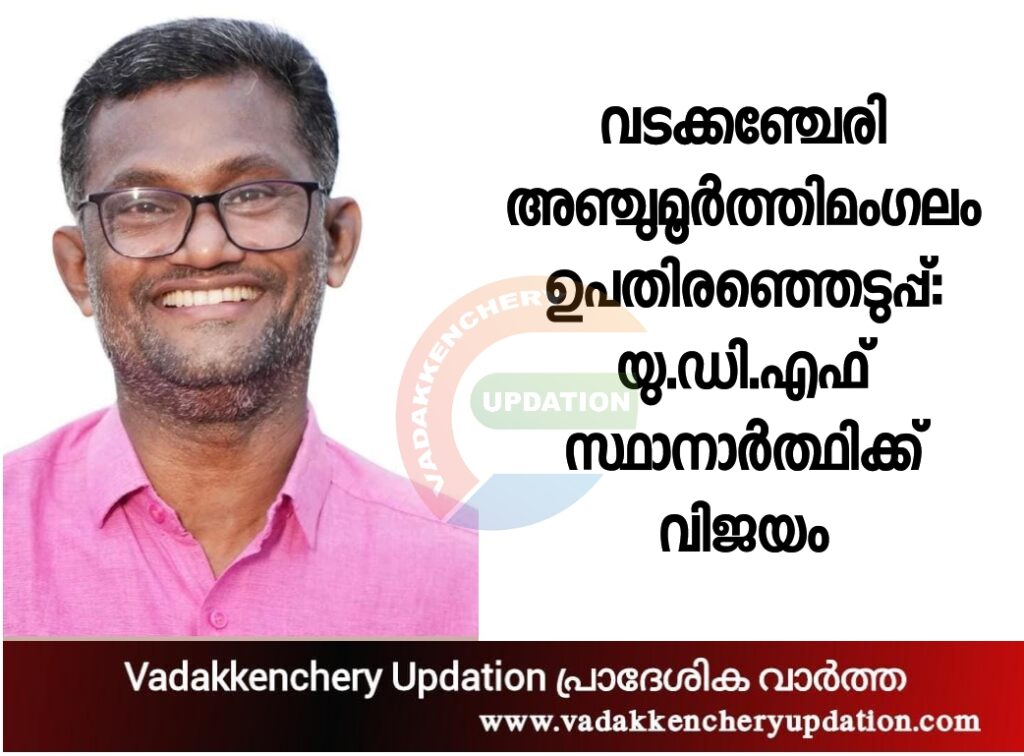 വടക്കഞ്ചേരി ഗ്രാമപഞ്ചായത്ത് ആറാം വാർഡ് അഞ്ചുമൂർത്തി ഉപതിരഞ്ഞെടുപ്പിൽ യു.ഡി.എഫ് സ്ഥാനാർത്ഥി സതീഷ്കുമാർ 325 വോട്ടിന്റെ ഭൂരിപക്ഷത്തിൽ വിജയിച്ചു LDF സ്ഥാനാർത്ഥി മുരളീധരൻ രാജിവെച്ചതിനെ തുടർന്നാണ് തെരഞ്ഞെടുപ്പ് നടന്നത്