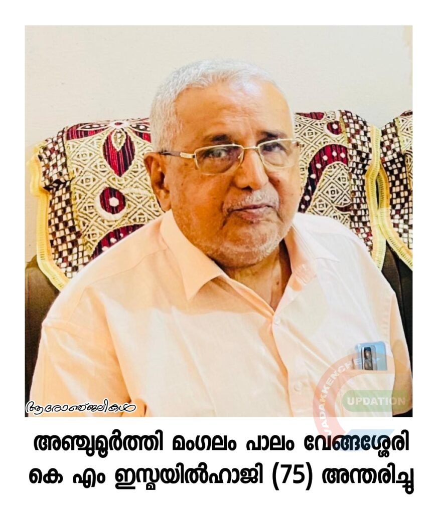 അഞ്ചുമൂർത്തി മംഗലം പാലം വേങ്ങശ്ശേരി പരേതനായ മുഹമ്മദ്കുട്ടി ഹാജി മകൻ കെ എം ഇസ്മയിൽഹാജി(സിപിഐഎം മംഗലം പാലം ബ്രാഞ്ച് അംഗം)(75 ) അന്തരിച്ചു