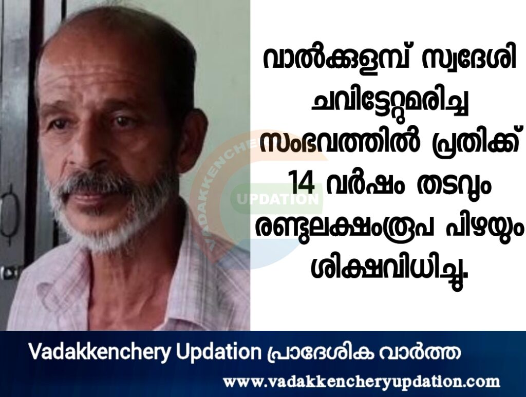 മണ്ണാർക്കാട് വാൽക്കുളമ്പ് സ്വദേശി ചവിട്ടേറ്റുമരിച്ച സംഭവത്തിൽ പ്രതിക്ക് 14 വർഷം തടവും രണ്ടുലക്ഷംരൂപ പിഴയും ശിക്ഷവിധിച്ചു. വാൽക്കുളമ്പ് പ്ലാപ്പിള്ളിയിൽ വീട്ടിൽ ജോണിനാണ് (60) മണ്ണാർക്കാട് പട്ടികജാതി-പട്ടികവർഗ പ്രത്യേക കോടതി ജഡ്ജി ജോമോൻ ജോൺ ശിക്ഷവിധിച്ചത്. വാൽക്കുളമ്പ് കണിച്ചിപ്പരുത സ്വദേശി വേലായുധനാണ് (52) ചവിട്ടേറ്റ് പരിക്കുപറ്റിയതിനെത്തുടർന്ന് ചികിത്സയിലിരിക്കേ മരിച്ചത്. പിഴ അടയ്ക്കാത്തപക്ഷം അധിക കഠിനതടവും അനുഭവിക്കണം. പിഴത്തുകയിൽനിന്ന് ഒരുലക്ഷംരൂപ വേലായുധന്റെ ആശ്രിതർക്ക് നൽകാനും ഉത്തരവിട്ടു