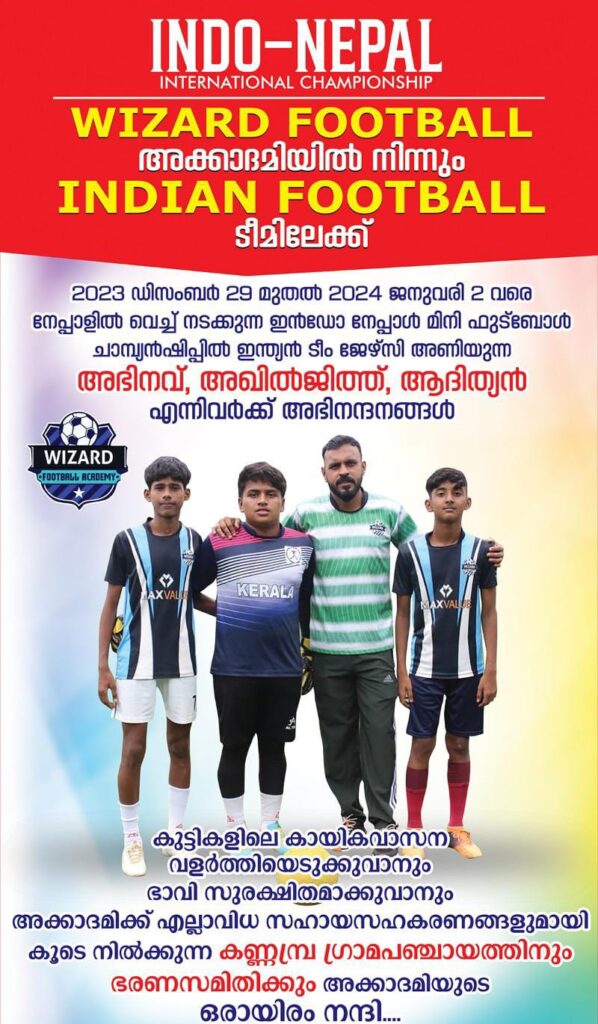 വിസാർഡ് ഫുട്ബോൾ അക്കാദമി കണ്ണമ്പ്രയിൽ ഒരു വർഷത്തിലധികമായി പരിശീലനം ചെയ്തുവരുകയും തുടർന്ന് പാലക്കാട് വച്ച് നടന്ന പാലക്കാട് ജില്ല ടീം സെലക്ഷൻ ട്രയൽസിൽ പങ്കെടുക്കുകയും സെലക്ഷൻ ലഭിക്കുകയും ചെയ്തതിനെ തുടർന്ന് ജില്ലാ ടീമിനായി കളിക്കുകയും ജില്ലാ ടീമിൽ നിന്നും കേരള ടീമിലേക്ക് സെലക്ഷൻ ലഭിക്കുകയും മണ്ണാർക്കാട് വെച്ച് നടന്ന മത്സരത്തിൽ കേരളത്തിന് വേണ്ടി കളിക്കുകയും അവിടെനിന്നും ഇന്ത്യൻ ഫുട്ബോൾ ടീമിലേക്ക് സെലക്ഷൻ ലഭിക്കുകയും ചെയ്തു 2023 ഡിസംബർ 29 മുതൽ 2024 ജനുവരി 2 വരെ നേപ്പാളിൽ വച്ച് നടക്കുന്ന മിനി ഇന്റർനാഷണൽ ഫുട്ബോൾ ചാമ്പ്യൻഷിപ്പിൽ വിസാർഡ് ഫുട്ബോൾ അക്കാദമി കണ്ണമ്പ്രയിൽ നിന്നും അഭിനവ്, അഖിൽ ജിത്ത്, ആദിത്യൻ എന്നിവർ ഇന്ത്യൻ ടീമിനായി ജേഴ്സി അണിയും കുട്ടികളെ ഇന്ത്യൻ ടീമിലേക്ക് യാത്ര അയക്കുന്നതിന്റെ ഭാഗമായി 24-12-2023 ഞായറാഴ്ച കണ്ണമ്പ്ര ഗ്രൗണ്ടിൽ വെച്ച് തരൂർ M L A സുമോദിന്റെ നേതൃത്വത്തിൽ കണ്ണമ്പ്ര ഗ്രാമപഞ്ചായത്ത് പ്രസിഡന്റ് സുമതി ടീച്ചർ പാലക്കാട് ജില്ല 9 A side ഫുട്ബോൾ അസോസിയേഷൻ സെക്രട്ടറി ശിവശണ്മുഖൻ വാർഡ് മെമ്പർമാർ തുടങ്ങിയ വിശിഷ്ട വ്യക്തികളുടെ നേതൃത്വത്തിലും കുട്ടികളെ ഇന്ത്യൻ ടീമിലേക്ക് യാത്ര അയക്കുന്നു ഈ ചുരുങ്ങിയ കാലയളവിൽ വിസാർഡ് ഫുട്ബോൾ അക്കാദമിയിൽ നിന്നും ഇന്ത്യയിലെ പ്രമുഖ ഫുട്ബോൾ അക്കാദമുകളിലേക്കും ജില്ലാ ടീമുകളിലേക്കും തുടർന്ന് ഇന്ത്യൻ ടീമിലേക്കും കുട്ടികളെ എത്തിക്കുവാൻ സാധിച്ചതിൽ വിസാർഡ് ഫുട്ബോൾ അക്കാദമിയുടെ ഫൗണ്ടർ എന്ന നിലയിൽ അഭിമാനിക്കുന്നു എന്നും ഇനിയും ഒരുപാട് കുട്ടികളെ ഫുട്ബോളിൽ കൈപിടിച്ചുയർത്തുവാൻ വിസാർഡ് ഫുട്ബോൾ അക്കാദമി മികുവുറ്റ പരിശീലനം തുടർന്നുകൊണ്ടിരിക്കുമെന്ന് അക്കാദമി ഫൗണ്ടർ നിഷാദ് അറിയിച്ചു.