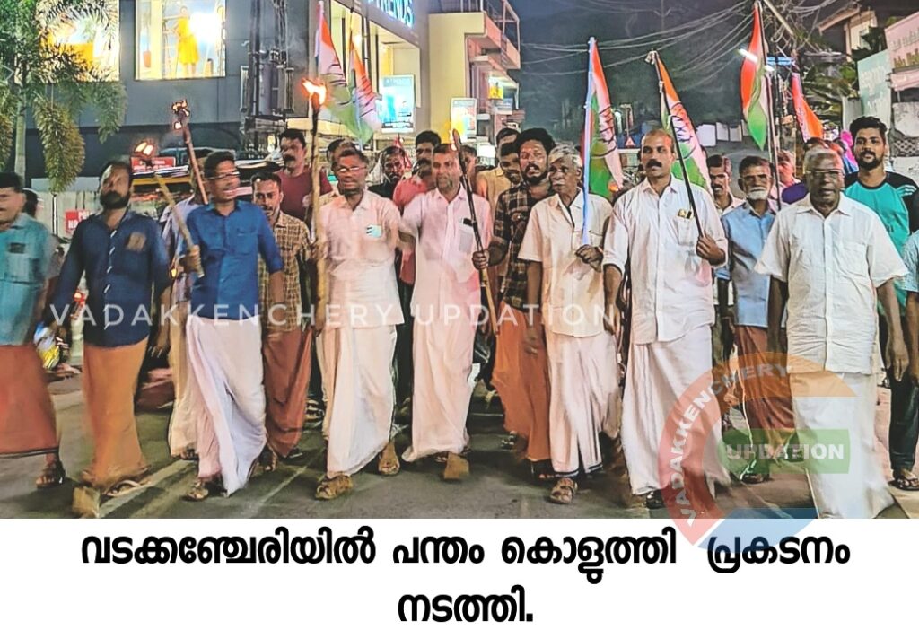 തിരുവനന്തപുരം പോലീസ് ആസ്ഥാനത്തേക്ക് KPCC നടത്തിയ പ്രതിഷേധമാർച്ചിൽ കോൺഗ്രസ്സ് നേതാക്കളെ പോലീസ് ഗ്രനേഡ് പ്രയോഗിച്ചും, ജലപീരങ്കി ഉപയോഗിച്ചും, ലാത്തിച്ചാർജ് നടത്തിയതിൽ പ്രതിഷേധിച്ച് കോൺഗ്രസ് വടക്കഞ്ചേരി മണ്ഡലം കമ്മിറ്റിയുടെ നേതൃത്വത്തിൽ ടൗണിൽ പന്തം കൊളുത്തി പ്രകടനം നടത്തി. പ്രതിഷേധ പ്രകടനം ഡി.സി.സി ജനറൽ സെക്രട്ടറി ഡോക്ടർ അർസലൻ നിസാം ഉദ്ഘാടനം ചെയ്തു. വടക്കഞ്ചേരി മണ്ഡലം കോൺഗ്രസ് പ്രസിഡണ്ട് ഇല്ല്യസ് പടിഞ്ഞാറെകളം അധ്യക്ഷത വഹിച്ചു. വടക്കഞ്ചേരി ബ്ലോക്ക് കോൺഗ്രസ് പ്രസിഡണ്ട് അഡ്വ. എം. ദിലീപ് , പഞ്ചായത്ത് മെമ്പർ സതീഷ് കുമാർ.ജി, പി.കെ നന്ദകുമാർ, കെ.സി അബ്ദുറഹ്മാൻ , രാധാകൃഷ്ണൻ , വി എച്ച് ബഷീർ , വി എ മൊയ്തു, സി.പ്രകാശൻ, ജയപ്രകാശൻ തുടങ്ങിയവർ സംസാരിച്ചു.