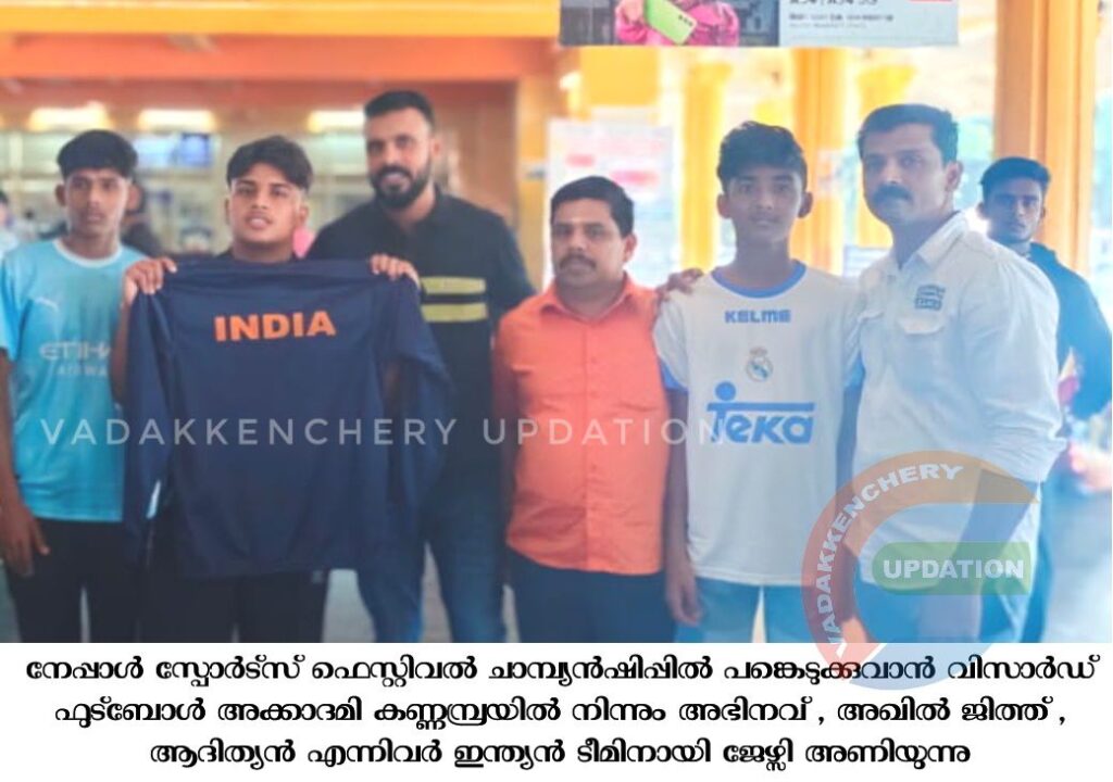 വിസാർഡ് ഫുട്ബോൾ അക്കാദമി കണ്ണമ്പ്രയിൽ ഒരു വർഷത്തിലധികമായി പരിശീലനം ചെയ്തുവരുകയും തുടർന്ന് പാലക്കാട് വച്ച് നടന്ന പാലക്കാട് ജില്ല ടീം സെലക്ഷൻ ട്രയൽസിൽ പങ്കെടുക്കുകയും സെലക്ഷൻ ലഭിക്കുകയും ചെയ്തതിനെ തുടർന്ന് ജില്ലാ ടീമിനായി കളിക്കുകയും ജില്ലാ ടീമിൽ നിന്നും കേരള ടീമിലേക്ക് സെലക്ഷൻ ലഭിക്കുകയും മണ്ണാർക്കാട് വെച്ച് നടന്ന മത്സരത്തിൽ കേരളത്തിന് വേണ്ടി കളിക്കുകയും അവിടെനിന്നും ഇന്ത്യൻ ഫുട്ബോൾ ടീമിലേക്ക് സെലക്ഷൻ ലഭിക്കുകയും ചെയ്തു 2023 ഡിസംബർ 29 മുതൽ 2024 ജനുവരി 2 വരെ നേപ്പാളിൽ വച്ച് നടക്കുന്ന ഇന്തോ നേപ്പാൾ സ്പോർട്സ് ഫെസ്റ്റിവലിൽ അണ്ടർ 14മിനി അണ്ടർ 17മിനി ഫുട്ബോൾ ഈ ഇനത്തിൽ ക്രിക്കറ്റ് എന്നീ മത്സരങ്ങൾക്കായി കേരളത്തിൽ നിന്നും 18 കുട്ടികൾ തിരഞ്ഞെടുക്കപ്പെടുകയും അണ്ടർ 14 വിഭാഗത്തിൽ 4 ഇന്ത്യൻ ടീമിലേക്ക് തിരഞ്ഞെടുക്കപ്പെട്ടു കണ്ണൂർ നിന്ന് 2 കുട്ടികൾ മലപ്പുറത്ത് നിന്ന് ഒരു കുട്ടി പാലക്കാട് നിന്ന് ഒരു കുട്ടി പാലക്കാട് നിന്നുള്ള ആദിത്യൻ വിസാർഡ് ഫുട്ബോൾ അക്കാദമിയിൽ നിന്ന് സെലക്ഷൻ കിട്ടിയ കുട്ടി ആണ് അണ്ടർ 17 മിനി ഫുട്ബോളിൽ മലപ്പുറത്തുനിന്ന് 1 കുട്ടി കണ്ണൂരിൽ നിന്ന് 2 കുട്ടികൾ പാലക്കാട് നിന്ന് 2 കുട്ടികൾ പാലക്കാട് നിന്നുള്ള രണ്ടുപേർ വിസാർഡ് ഫുട്ബോൾ അക്കാദമിയിൽ നിന്നുള്ള കുട്ടികളാണ് കേരളത്തിൽ നിന്നും ആകെ 18 കുട്ടികൾ ഇൻഡോ നേപ്പാൾ സ്പോർട്സ് ഫെസ്റ്റിവൽ പങ്കെടുക്കുന്നത് ആകെ 300 അടുത്ത് കുട്ടികൾ ഈ ചാമ്പ്യൻഷിപ്പിൽ ഇന്ത്യയെ പ്രതിനിധീകരിച്ച് പങ്കെടുക്കുന്നുണ്ട് ചാമ്പ്യൻഷിപ്പിൽ വിസാർഡ് ഫുട്ബോൾ അക്കാദമി കണ്ണമ്പ്രയിൽ നിന്നും അഭിനവ്, അഖിൽ ജിത്ത്, ആദിത്യൻ എന്നിവർ ഇന്ത്യൻ ടീമിനായി ജേഴ്സി അണിയും കുട്ടികളെ ഇന്ത്യൻ ടീമിലേക്ക് യാത്ര അയക്കുന്നതിന്റെ ഭാഗമായി 24-12-2023 ഞായറാഴ്ച കണ്ണമ്പ്ര ഗ്രൗണ്ടിൽ വെച്ച് കണ്ണമ്പ്ര ഗ്രാമപഞ്ചായത്ത് പ്രസിഡന്റ് സുമതി ടീച്ചറുടെ നേതൃത്വത്തിൽ പാലക്കാട് ജില്ല 9 A side ഫുട്ബോൾ അസോസിയേഷൻ സെക്രട്ടറി ശിവശണ്മുഖൻ കുട്ടികൾക്ക് ഫുട്ബോൾ നൽകി യാത്രയയപ്പ് നൽകി പഞ്ചായത്ത് വൈസ് പ്രസിഡന്റ് മുരളി വാർഡ് മെമ്പർമാർ മുൻ പഞ്ചായത്ത് പ്രസിഡന്റ് സുരേന്ദ്രൻ എക്സൈസ് ഇൻസ്പെക്ടർ രാജേഷ് തുടങ്ങിയ വിശിഷ്ട വ്യക്തികളും ഫുട്ബോൾ അക്കാദമിയിലെ രക്ഷിതാക്കളുടെ കമ്മിറ്റി അംഗങ്ങളും മറ്റു രക്ഷിതാക്കളും ചടങ്ങിൽ പങ്കെടുക്കുകയുണ്ടായി.ഈ ചുരുങ്ങിയ കാലയളവിൽ വിസാർഡ് ഫുട്ബോൾ അക്കാദമിയിൽ നിന്നും ഇന്ത്യയിലെ പ്രമുഖ ഫുട്ബോൾ അക്കാദമുകളിലേക്കും ജില്ലാ ടീമുകളിലേക്കും തുടർന്ന് ഇന്ത്യൻ ടീമിലേക്കും കുട്ടികളെ എത്തിക്കുവാൻ സാധിച്ചതിൽ വിസാർഡ് ഫുട്ബോൾ അക്കാദമിയുടെ ഫൗണ്ടർ എന്ന നിലയിൽ അഭിമാനിക്കുന്നു എന്നും ഇനിയും ഒരുപാട് കുട്ടികളെ ഫുട്ബോളിൽ ക