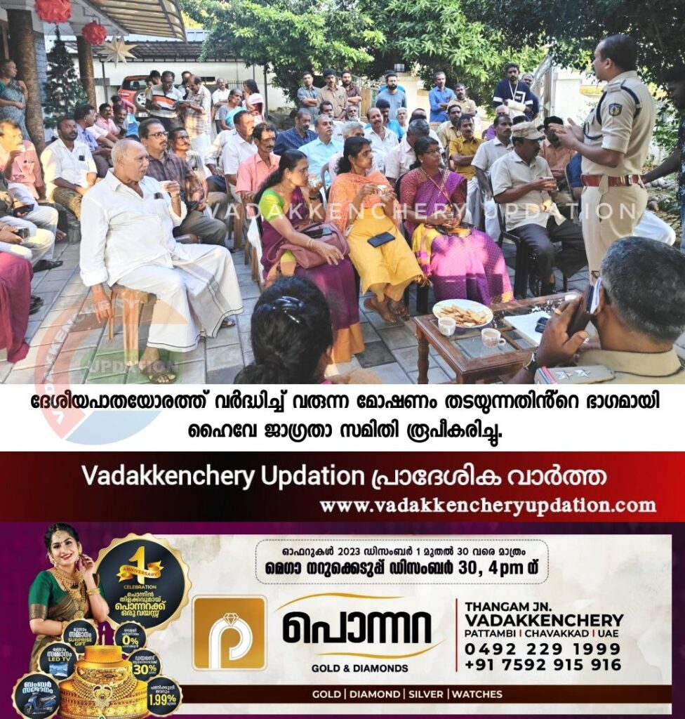 ദേശീയപാതയോരത്ത് വർദ്ധിച്ച് വരുന്ന മോഷണം തടയുന്നതിൻ്റെ ഭാഗമായി ഹൈവേ ജാഗ്രതാ സമിതി രൂപീകരിച്ചു. ദേശീയപാതയോരത്ത് മോഷണങ്ങൾ വർദ്ധിച്ചു വരുന്ന സാഹചര്യത്തിലാണ് പ്രദേശവാസികളെയും, പ്രദേശത്തെ ജനപ്രതിനിധികളെയും ഉൾപ്പെടുത്തി പൊലീസിൻ്റെ നേതൃത്വത്തിൽ ഹൈവേ സംരക്ഷണ സമിതി രൂപീകരിച്ചത്.