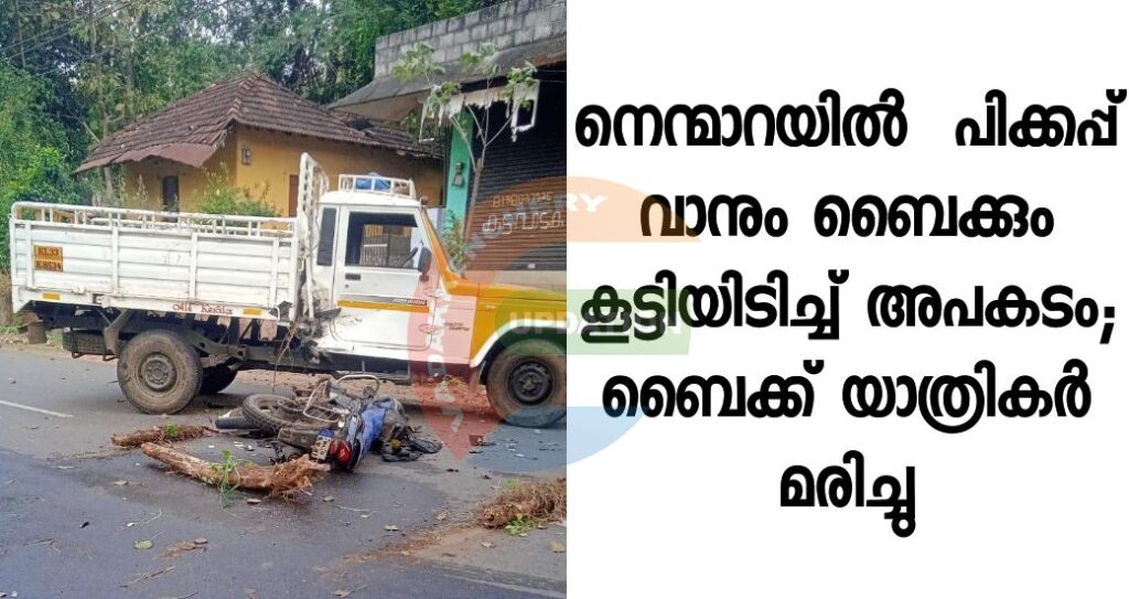 ആലത്തൂർ ഭാഗത്ത് നിന്ന് നെന്മാറയിലേക്ക് പോവുകയായിരുന്നു പിക്കപ്പ് വാൻ. നെന്മാറ ഭാഗത്തേക്ക് പോവുകയായിരുന്നു ബൈക്ക്. മറ്റൊരു വാഹനത്തെ മറികടക്കാൻ ശ്രമിക്കുന്നതിനിടെ ബൈക്ക് പിക്കപ്പ് വാനിന്റെ വലതുവശത്ത് ഇടിച്ചുകയറുകയായിരുന്നുവെന്നാണ് ദൃക്സാക്ഷികൾ പറയുന്നത്. ബൈക്കിൽ നിന്ന് തെറിച്ചുവീണ പൊന്നുമണിയും സന്തോഷും സംഭവ സ്ഥലത്ത് തന്നെ മരിച്ചു.