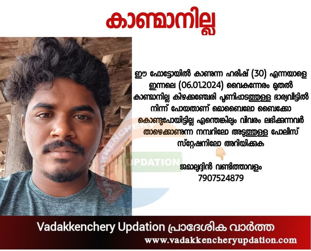 ഈ ഫോട്ടോയിൽ കാണുന്ന ഹരീഷ് (30) എന്നയാളെ ഇന്നലെ (06.01.2024) വൈകുന്നേരം മുതൽ കാണ്മാനില്ല കിഴക്കഞ്ചേരി പൂണിപ്പാടത്തുള്ള ഭാര്യവീട്ടിൽ നിന്ന് പോയതാണ് മൊബൈലോ ബൈക്കോ കൊണ്ടുപോയിട്ടില്ല എന്തെങ്കിലും വിവരം ലഭിക്കുന്നവർ താഴെക്കാണുന്ന നമ്പറിലോ അടുത്തുള്ള പോലീസ് സ്റ്റേഷനിലോ അറിയിക്കുക