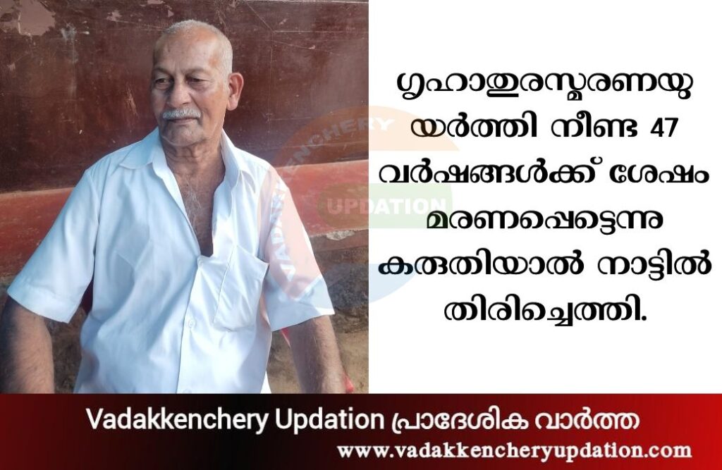 നീണ്ട 47വർഷത്തിനുശേഷം വീട്ടുകാർ മരിച്ചെന്നു കരുതിയ കൂമട യൂസഫ് തിരിച്ചെത്തി. ഒരു ഉൾവിളിപോലെ. 39-ാം വയസിൽ ആയിലൂർ കയറാടി ആലമ്പള്ളത്തെ വീട്ടിൽ നിന്ന് നാടുവിട്ടുപോയ കുമട യൂസഫ് (86)ആണ് ഗൃഹാതുരത്വ സ്മരണ പേറി നാട്ടിൽ തിരിച്ചെത്തിയത്. വീട്ടുകാരെ കാണാനുള്ള ദീർഘകാലത്തെ അലട്ടലിനൊടുവിൽ കഴിഞ്ഞ ദിവസമാണ് യൂസഫ് നാട്ടിലെത്തിയത്. 47 വർഷത്തെ ഇടവേളയും നാട്ടിൽ ഉണ്ടായ മാറ്റവും യൂസഫിന് ആദ്യം തിരിച്ചറിയാൻ ബുദ്ധിമുട്ടായി. നെന്മാറയിൽ എത്തിയ യൂസഫ് ബസ്റ്റാന്റും കെട്ടിടങ്ങളും കണ്ട് സ്ഥലം മാറിയതായി ആദ്യം സംശയിച്ചെങ്കിലും, ആശുപത്രി, പോലീസ് സ്റ്റേഷൻ പരിസരങ്ങളിലൂടെ നടന്നതോടെ പഴയ നാട് തിരിച്ചറിഞ്ഞു. നെന്മാറയിൽ നിന്ന് അടിപ്പെരണ്ട പൂവച്ചോട് ബസ് ഇറങ്ങി ആലംപള്ളത്തേക്ക് നടന്നെങ്കിലും റോഡിന് ഇരുവശവും വീടുകളും വർഷങ്ങൾ മുമ്പ് വീടുനിന്ന സ്ഥലത്ത് പുതിയ വീടുകളും വന്നതോടെ വീട് നിന്നിരുന്ന സ്ഥലവും കടന്ന് ഏറെ ദൂരം മുന്നോട്ടുപോയി. പരിചിത മുഖങ്ങളും പരിചയക്കാരെയും കാണാതായതോടെ പരിസരത്ത് അന്വേഷിച്ചപ്പോൾ ഇദ്ദേഹം പറയുന്ന ആൾക്കാരെ ആരെയും അവർക്ക് തിരിച്ചറിയുന്നില്ല. തിരിച്ച് ബസ്റ്റോപ്പിലേക്ക് നടക്കുന്നതിനിടെ ഒരാളോട് ചോദിച്ചപ്പോഴാണ് തൊട്ടടുത്തുള്ളത് മകളുടെ വീടാണെന്ന് മനസ്സിലായത്. താടി വളർത്തിയ യൂസഫിനെ പഴയ സുഹൃത്തുക്കൾക്കും ആദ്യം തിരിച്ചറിയാനായില്ല. മൂത്ത മകളുടെ ഭർത്താവ് സി. എം യൂസഫ് ആണ് ശബ്ദം കൊണ്ട് ആളെ തിരിച്ചറിഞ്ഞത്. വടക്കഞ്ചേരി സ്വദേശിയായ വീരാസ്വാമിയുടെ കാക്രാംകോട്ടുള്ള തോട്ടത്തിന്റെ മേൽ നോട്ടക്കാരനായിരുന്നു കൂമട യൂസഫ്. തോട്ടം ഉടമ വഴക്ക് പറഞ്ഞതിനുള്ള വിഷമത്തിലാണ് യൂസഫ് വീട് വിട്ടിറങ്ങി പോയത്. അന്ന് ഒപ്പം തോട്ടത്തിൽ ജോലി ചെയ്തിരുന്ന ചാമിയും മരണമടഞ്ഞു. ആദ്യം കോയമ്പത്തൂർ മൂന്നുദിവസം ജോലി ചെയ്തെങ്കിലും പിന്നീട് തടാകം വഴി അട്ടപ്പാടി ആനക്കട്ടിയിലും കുറച്ചുനാൾ ജോലി ചെയ്തു. പിന്നീട് അട്ടപ്പാടി മുക്കാലിയിൽ തടയണയുടെ നിർമ്മാണ ജോലിയുമായി മൂന്നുവർഷം കഴിച്ചുകൂട്ടിയ ശേഷമാണ് ഇപ്പോൾ താമസിക്കുന്ന മുക്കം, അരീക്കോട്, എത്തുന്നത്. ഇതിനിടെ വീട്ടുകാരുമായി ബന്ധപ്പെടുന്നതിനോ മറ്റോ യൂസഫ് ശ്രമിച്ചില്ല. ആദ്യം വീട് വിട്ടിറങ്ങിയ സമയത്ത് മക്കളും ബന്ധുക്കളും നാട്ടിൽ മുഴുവൻ അന്വേഷിച്ചെങ്കിലും കണ്ടെത്താൻ കഴിഞ്ഞില്ല. ദിവസങ്ങൾക്ക് ശേഷം മരുമകൻ സി. എം. യൂസഫ് കോയമ്പത്തൂരിൽ വച്ച് കണ്ടെത്തിയെങ്കിലും വീട്ടിലേക്ക് വരാമെന്ന് സമ്മതിക്കുകയും എന്നാൽ വീട്ടിൽ എത്തുകയും ഉണ്ടായില്ല. തുടർന്നാണ് അദ്ദേഹം അട്ടപ്പാടിയിലേക്ക് ജോലി തേടി പോയത്. അട്ടപ്പാടിയിൽ നിന്ന് പോയശേഷമുള്ള 44 വർഷം യൂസഫ് നാടുമായി ബന്ധം പുലർത്താൻ തയ്യാറായില്ല. ഇതിനിടെ 27 വർഷം മുമ്പ് യൂസഫിന