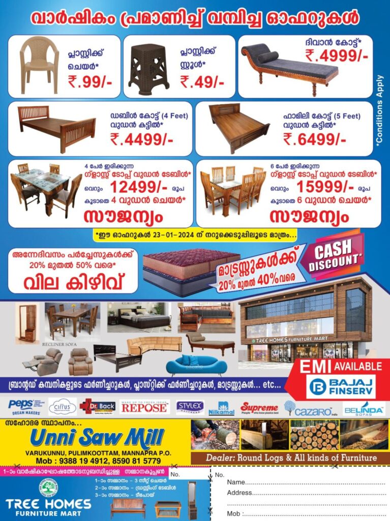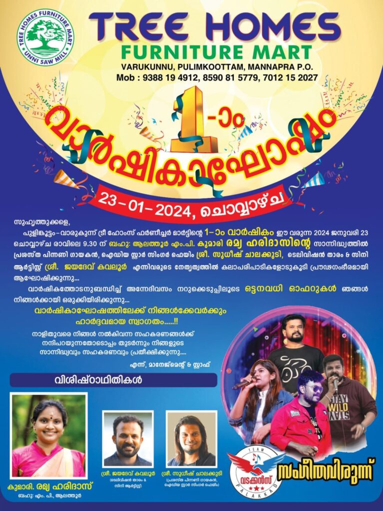 ട്രീ ഹോംസ് ഫർണീച്ചർ മാർട്ടിൻ്റെ 1-ാം വാർഷികം ഈ വരുന്ന 2024 ജനുവരി 23 ചൊവ്വാഴ്ച രാവിലെ 9.30 ന് ആലത്തൂർ എം.പി. കുമാരി രമ്യ ഹരിദാസിൻ്റെ സാന്നിദ്ധ്യത്തിൽ പ്രശസ്ത പിന്നണി ഗായകൻ, ഐഡിയ സ്റ്റാർ സിംഗർ ഫെയിം ശ്രീ. സുധീഷ് ചാലക്കുടി, ടെലിവിഷൻ താരം & സിനി ആർട്ടിസ്റ്റ് ജയദേവ് കവലൂർ എന്നിവരുടെ നേതൃത്വത്തിൽ കലാപരിപാടികളോടുകൂടി പ്രൗഢഗംഭീരമായി
