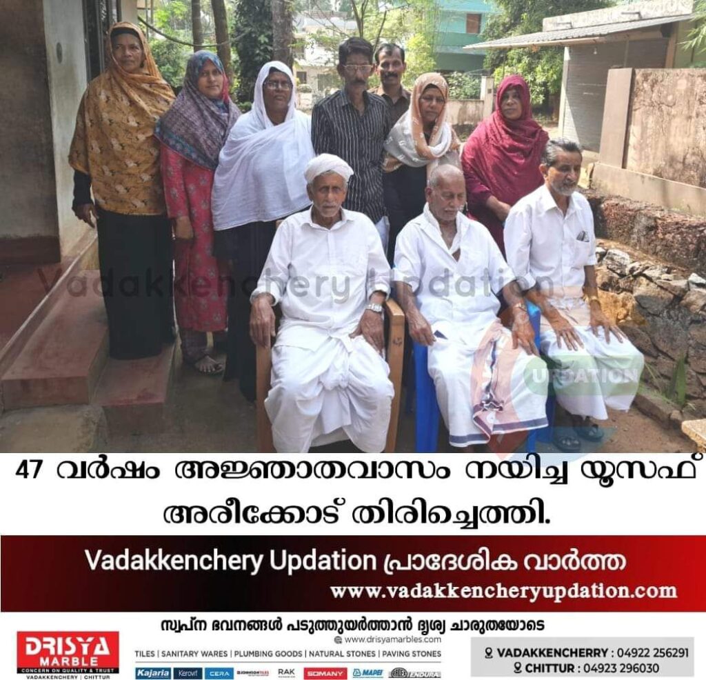 47 വർഷത്തെ അജ്ഞാത വാസത്തിനുശേഷം നാട്ടിൽ തിരിച്ചെത്തിയ യൂസഫ് മലപ്പുറം അരീക്കോട്ടേക്ക് മടങ്ങി. മരണമടഞ്ഞെന്ന് വീട്ടുകാർ കരുതിയ ശേഷം തിരിച്ചെത്തിയ കൂമട യൂസഫ് മക്കളെയും മരുമക്കളെയും കൂട്ടി മലപ്പുറം അരീക്കോട്ട് വെസ്റ്റ് പത്തനാപുരത്തെ വീട്ടിലെത്തി. അയിലൂർ ആലമ്പലത്തുള്ള രണ്ടു പെൺമക്കളെയും മരുമകനെയും തൃശ്ശൂർ മുടിക്കോട് താമസിക്കുന്ന മകനെയും കുടുംബത്തെയും കൂട്ടിയാണ് യൂസഫ് അരീക്കോട്ടേക്ക് യാത്രതിരിച്ചത്. ഉച്ചയോടെ അരീക്കോട് വെസ്റ്റ് പത്തനാപുരത്തെ വീട്ടിലെത്തിയതോടെ ഇരു കുടുംബങ്ങളുടെയും സംഗമ വേദിയായി മാറി. ഭാര്യ ഉമ്മാത്തുക്കുട്ടി, മക്കളായ ഹബീബ, സക്കീന, മരുമക്കളായ അലി, ഷമീർ എന്നിവരും ചേർന്നാണ് നെന്മാറ അയിലൂർ ആലമ്പള്ളത്തു നിന്നും പോയവരെ സ്വീകരിച്ചു. വിഭവസമൃദ്ധമായ ഭക്ഷണം നൽകി ഇരു കുടുംബങ്ങളുടെയും സൗഹൃദം ഊട്ടിയുറപ്പിച്ചു. 47 വർഷത്തെ അജ്ഞാതവാസത്തിന് ശേഷം ഗൃഹാതുര സ്മരണകളുടെ നെന്മാറ ആലമ്പലത്തുള്ള വീട്ടിലെത്തിയ കൂമട യൂസഫിന് ഉറ്റവരെ കണ്ടതും ബന്ധുക്കളും സുഹൃത്തുക്കളും നൽകിയ സ്നേഹവായ്പ്പും അരീക്കോട്ട് വീട്ടുകാരും അയൽക്കാരുമായും പങ്കുവെച്ചു.