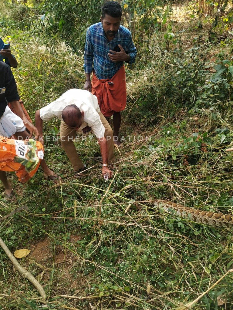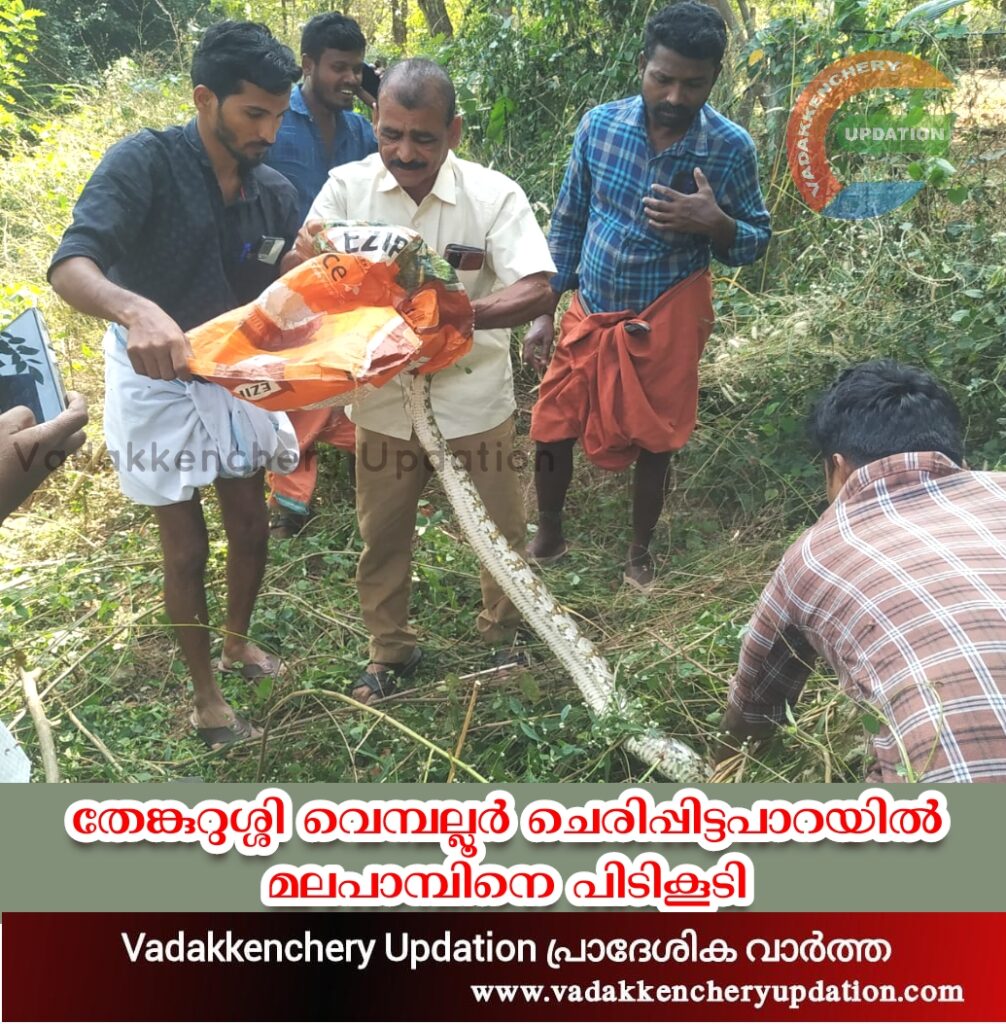 തേങ്കുറുശ്ശി വെമ്പല്ലൂർ ചെരിപ്പിട്ടപാറയിൽ തൊഴിലുറപ്പ് ജോലിക്കിടയിൽ കണ്ടെത്തിയ 6 അര അടി നീളമുള്ള മലപാബിനെ പിടികൂടി.വാച്ചർ സുകുമാരൻ , സിപിഐഎം ലോക്കൽ കമ്മിറ്റി സെക്രട്ടറി കെ ഷെരീഫ് ,
