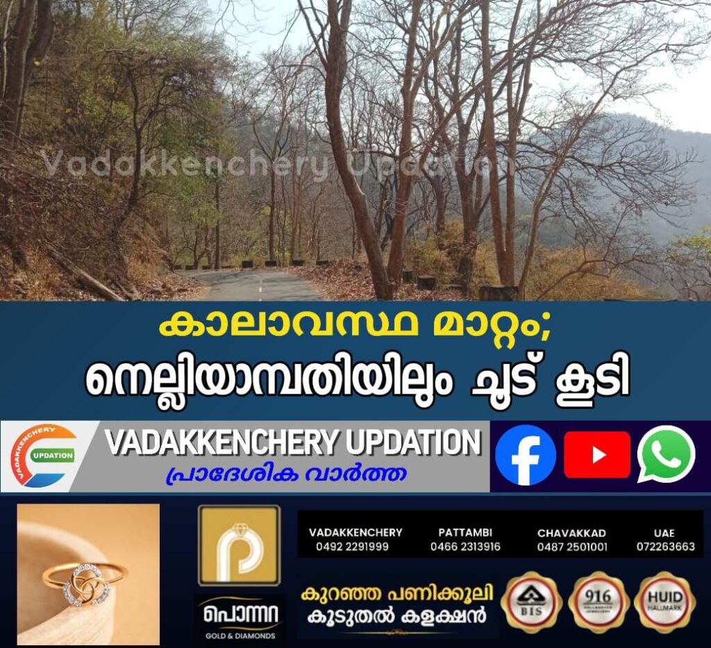നെല്ലിയാമ്പതിയിലും ചൂട് കൂടുന്നു. തണുപ്പു കൂടിയ വിനോദസഞ്ചാര മേഖല എന്ന ഖ്യാതി നേടിയ നെല്ലിയാമ്പതിയിലും ചൂട് കൂടുന്നതായി കണക്കുകൾ സൂചിപ്പിക്കുന്നു. പുലിയമ്പാറയിലും, കാരപ്പാറയിലും കഴിഞ്ഞവർഷം മാർച്ച് 19ന് കൂടിയ ചൂട് 31 ഡിഗ്രി രേഖപ്പെടുത്തിയ സ്ഥാനത്ത് ഇന്ന് 34 ഡിഗ്രി രേഖപ്പെടുത്തി. കുറഞ്ഞ ചൂട് 20 ഡിഗ്രിയും രേഖപ്പെടുത്തിയതോടെ നെല്ലിയാമ്പതിയിലെയും കാലാവസ്ഥാ മാറ്റം പാലക്കാട്ടിന് സമാനമായി മാറുന്നു. നിത്യഹരിത വനമേഖലകൾ ഒഴികെ ഇലകൊഴിയും വനമേഖലകളിലെ മരങ്ങളെല്ലാം ഇലപൊഴിച്ചു തുടങ്ങിയതോടെ പാറക്കൂട്ടങ്ങളും മണ്ണും ചൂട് പിടിച്ചതാണ് നെല്ലിയാമ്പതിയിലെ ചൂട് കൂടാൻ കാരണമെന്ന് വിദഗ്ധർ ചൂണ്ടിക്കാട്ടുന്നു. അതോടൊപ്പം ചൂടുകൂടിയ താഴ്വാരങ്ങളിലെ കാറ്റ് പ്രതിരോധിക്കാനുള്ള സസ്യജാലങ്ങൾ കുറഞ്ഞതോടെ തോട്ടം മേഖലയിലേക്ക് താഴെ നിന്നുള്ള വരണ്ട കാറ്റ് എത്തിത്തുടങ്ങിയതായി മേഖലയുള്ളവർ ചൂണ്ടിക്കാട്ടുന്നു. അർദ്ധരാത്രി മുതൽ രാവിലെ വരെ നേരിയ തോതിൽ മഞ്ഞും തണുപ്പും അനുഭവപ്പെടുന്നുണ്ട്. പകൽ സമയത്ത് കാറ്റ് ഇല്ലാതായതോടെയാണ് ചൂട് കൂടിയത്. പുലയമ്പാറ, നൂറടി പ്രദേശങ്ങളിൽ നല്ല ചൂട് അനുഭവപ്പെട്ടു തുടങ്ങി. നൂറടി, കാരപ്പാറ പുഴകളിലെ നീരൊഴുക്ക് നിലച്ച് വെള്ളം വറ്റിയതോടെ വന്യമൃഗങ്ങൾ എസ്റ്റേറ്റു കളിലെയും മറ്റും ചെക്ക് ഡാമുകൾക്ക് സമീപവും പറമ്പിക്കുളം മേഖല, പോത്തുണ്ടി ഡാം പ്രദേശങ്ങളിലേക്കും നീങ്ങിത്തുടങ്ങി. ഏതാനും വർഷങ്ങൾക്കു മുമ്പ് വരെ നെല്ലിയാമ്പതിയിലെ റിസോർട്ടുകളിലും, വീടുകളിലും, കടകളിലും ഫാൻ ഉപയോഗിക്കാതിരുന്ന സ്ഥിതി മാറി. എല്ലായിടത്തും ഫാനുകൾ സ്ഥാപിച്ചു തുടങ്ങി. സഫാരി സർവീസ് നടത്തുന്ന ആനമട ഭാഗത്തെ പുൽമേടുകളും ഉണങ്ങി. ഹരിതാഭമായ കുന്നിൻ ചെരുവ് ഇല്ലാതായി. നിത്യഹരിത വനങ്ങളോട് ചേർന്ന് പ്രദേശങ്ങൾ മാത്രമാണ് പച്ചനിറം നിലനിൽക്കുന്നത്. വേനൽ മഴ ലഭ്യമായാൽ ആഴ്ചകൾക്കുള്ളിൽ തന്നെ നെല്ലിയാമ്പതിയുടെ പച്ചപ്പ് വീണ്ടെടുക്കും. വേനൽ മഴയില്ലാതെ രണ്ടുമാസത്തോളം ആയതോടെയാണ് നെല്ലിയാമ്പതിയുടെ ചൂട് കൂടിയതും ഇലപൊഴിയും കാടുകളിലെ മരങ്ങൾ ഇലകൾ പൊഴിച്ചതും. വേനൽ മഴ വൈകിയാൽ വരും ദിവസങ്ങളിൽ ഇനിയും ചൂട് കൂടുമെന്ന് മേഖലയിലെ തൊഴിലാളികൾ ചൂണ്ടിക്കാട്ടുന്നു. ചൂട് കൂടിയതും പരീക്ഷാക്കാലമായതിനാലും രണ്ടാഴ്ചയായി നെല്ലിയാമ്പതിയിലേക്കുള്ള വിനോദസഞ്ചാരികളുടെ തിരക്ക് കുറഞ്ഞിട്ടുണ്ടെന്ന് സഫാരി ജീപ്പ് സർവീസുകാർ പറഞ്ഞു.