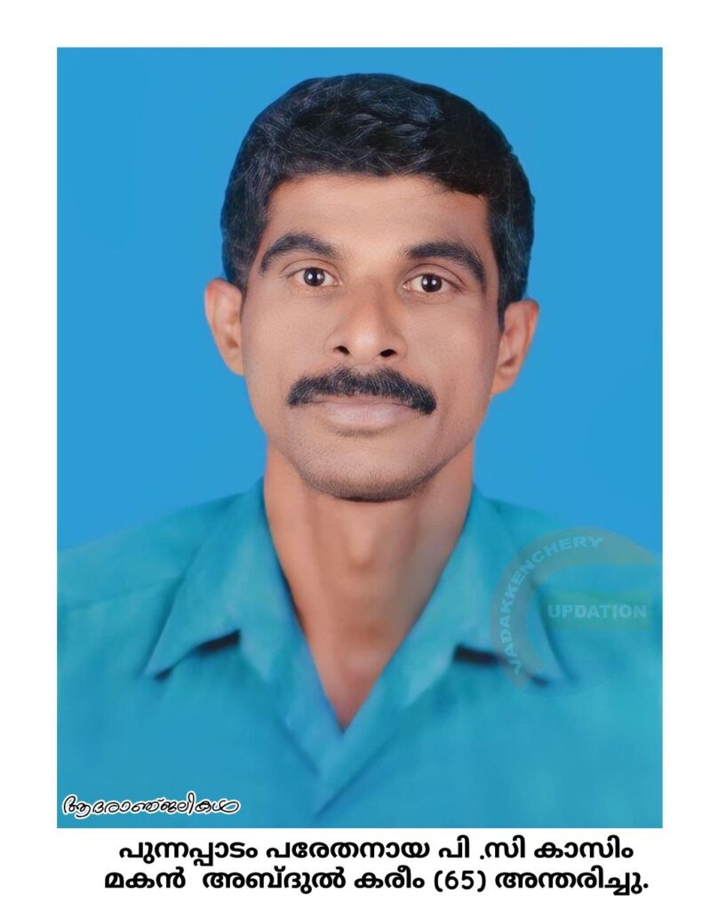 പുന്നപ്പാടം പരേതനായ പി .സി .കാസിം.മകൻ അബ്ദുൽ കരീം (65) അന്തരിച്ചു. സംസ്കാരം ഇന്ന് (22/03/2024)കാലത്ത് 10 മണിക്ക് പുന്നപ്പാടം കാക്കോട് പുത്തൻ പള്ളി കബർസ്ഥാനിൽ