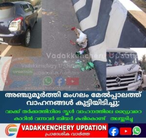 അഞ്ചുമൂർത്തി മംഗലം മേൽപ്പാലത്തിൽ വാഹനങ്ങൾ കുട്ടിയിടിച്ചു.നിസ്സാര പരുക്കേറ്റവരെ തൊട്ടടുത്ത ആശുപത്രിയിൽ പ്രവേശിച്ചു. മുന്നിൽ സഞ്ചരിച്ച കാർ ബീയർ കുപ്പി കളയുന്നതിനായി പെട്ടെന്ന് കാർ നിർത്തുകയും അതിൻ്റെ പുറകിൽ വന്നിരുന്ന തമിഴ്നാട് റെജിസ്ട്രഷനിലുള്ള ലോറിയും ചവിട്ടി നിർത്തിയതും അതിൻ്റെ പിന്നിലായിരുന്ന സ്കൂൾ കുട്ടികളുമായി പോകുന്ന വണ്ടി ലോറിയിൽ ചെന്ന് തട്ടുകയായിരുന്നു. സംഭവം നടന്ന് വാക്ക് തർക്കത്തിനിടെ കാറിൽ യാത്രചെയ്തിരുന്നവർ ബിയർ കുപ്പി കൊണ്ട് തലയ്ക്ക് അടിച്ചു ട്രാവലറിലെ ഡ്രൈവർക്ക് തലയ്ക്ക് പരുക്കേറ്റു . സംഭവം നടന്ന ഉടനെ കാറിൽ ഉള്ളവർ വേഗം കടന്ന് കളഞ്ഞു. കാറിൽ സഞ്ചരിച്ചിരുന്നവർ മദ്ധ്യ ലഹരിയിലായിരുന്നെനും എത്രയും പെട്ടെന്ന് ഇവരെ കണ്ടെത്തണമെന്നും ആവശ്യപ്പെട്ട് സ്കൂൾ വാഹനത്തിൻ്റെ ഡ്രൈവർ പരാതി നൽകിയതിനെ തുടർന്ന് .വടക്കഞ്ചേരി പോലീസ് കേസെടുത്തു