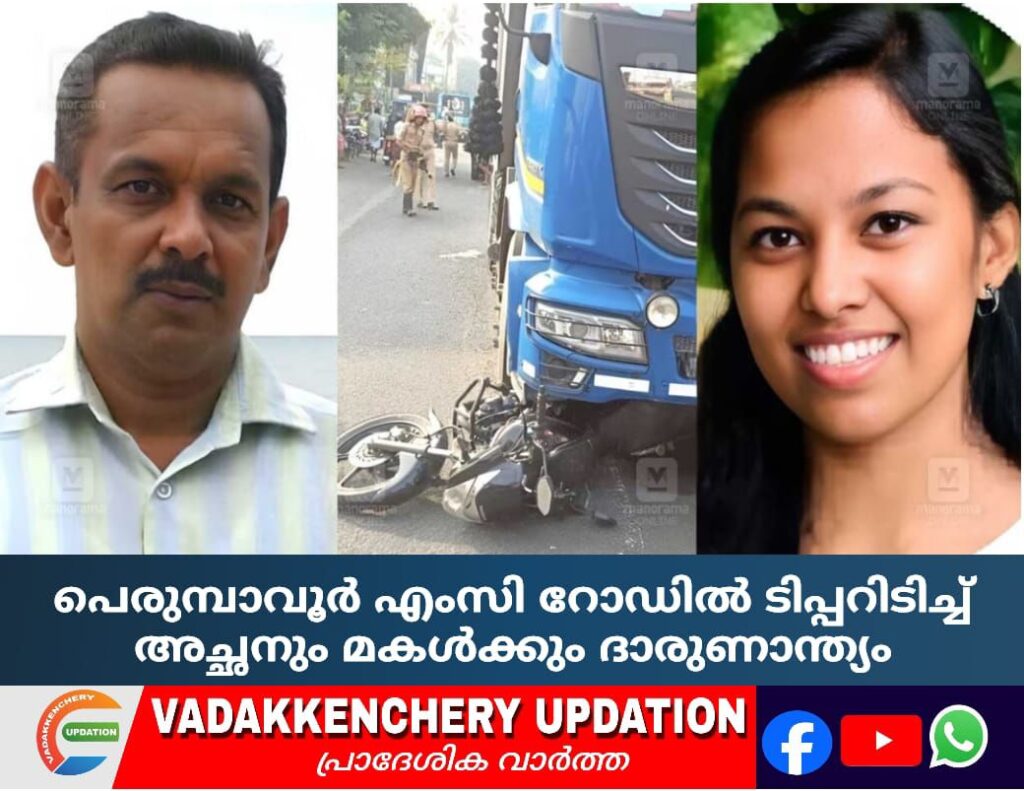 പെരുമ്പാവൂർ എംസി റോഡിൽ താന്നിപ്പുഴ പള്ളിപ്പടിയിൽ ടോറസ് ലോറിയിടിച്ച് ബൈക്ക് യാത്രികരായ അച്ഛനും മകൾക്കും ദാരുണാന്ത്യം. കോതമംഗലം കറുകടം കുന്നശേരിൽ കെ.ഐ. എൽദോ (52), നഴ്സിങ് വിദ്യാർഥിനിയായ മകൾ ബ്ലെസി എന്നിവരാണ് മരിച്ചത്. ഇന്നു രാവിലെ 7.45 ഓടെ പെരുമ്പാവൂർ – കാലടി റൂട്ടിൽ താന്നിപ്പുഴ പള്ളിപ്പടിക്കു സമീപമാണ് അപകടം.