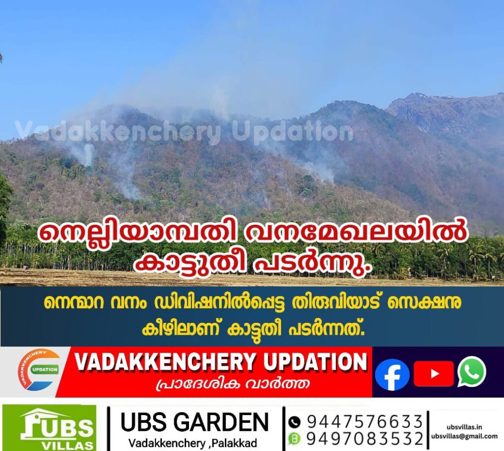 നെല്ലിയാമ്പതി മലനിരയുടെ പടിഞ്ഞാറൻ ചരുവിൽ കാട്ടുതീ പടർന്നു. നെന്മാറ വനം ഡിവിഷനിൽപ്പെട്ട തിരുവിയാട് സെക്ഷനു കീഴിലാണ് കാട്ടുതീ പടർന്നത്. ഹെക്ടർ കണക്കിന് വനമേഖലയിൽ തീ പടർന്നതായാണ് പ്രാഥമിക വിവരം. ചൊവ്വാഴ്ച രാവിലെ 11 മണിയോടെയാണ് കരിമ്പാറയിൽ നിരീക്ഷണം നടത്തിയ വാച്ചർമാരാണ് വനമേഖലയിൽ നിന്നും പുക ഉയരുന്നത് കണ്ടത്. സെക്ഷൻ ജീവനക്കാരെ വിവരമറിയിച്ച് കൂടുതൽ വാച്ചർ മാരുടെയും മറ്റും സേവനം തീ നിയന്ത്രിക്കാൻ ലഭ്യമാക്കിയിട്ടുണ്ട്. തിരുവഴിയാട് സെക്ഷൻ ജീവനക്കാരും വാച്ചർമാരും അടങ്ങുന്ന സംഘം രണ്ട് ബ്ലോവർ മെഷീനുകൾ ഉൾപ്പെടെ വനമേഖലയിലേക്ക് ഈ നിയന്ത്രിക്കാൻ പോയിട്ടുണ്ടെന്ന് ജീവനക്കാർ അറിയിച്ചു. കരിമ്പാറയ്ക്ക് അടുത്ത് നിരങ്ങൻ പാറയ്ക്കും കൽച്ചാടി മലകൾക്കും ഇടയിലുള്ള വിറയൽ കുന്ന് പ്രദേശത്താണ് കാട്ടുതീ പടർന്നത്. കുത്തനെയുള്ള മലഞ്ചെരുവിൽ ശക്തമായ ചൂടുകാറ്റും, മരങ്ങളിലെ ഇലകൾ കൊഴിഞ്ഞ ചപ്പുചവറുകൾ കൂടിക്കിടക്കുന്നതും, ഉണങ്ങിയ പുല്ലും കാട്ടുതീ അതിവേഗം മലമുകളിലേക്ക് പടരാനിടയാക്കി. കിലോമീറ്റർ അകലെ നിന്നും വനം വനമേഖലയിലെ തീയും പുകയും ഉയരുന്നത് കാണാവുന്ന സ്ഥിതിയായി. വനപ്രദേശത്ത് പകൽ സമയം തീ പടർന്ന് മൂടൽമഞ്ഞ് രൂപേന കനത്ത പുക ഉയർന്നുകൊണ്ടിരുന്നു. കാട്ടുതീ വ്യാപനം കുറയ്ക്കുന്നതിന് ബ്ലോവറുകൾ ഉപയോഗിച്ച് ഫയർ ബ്രേക്കർ ലൈനുകൾ എടുത്തും ആളുകൾക്ക് എത്താൻ കഴിയുന്ന മേഖലകളിൽ തല്ലിക്കെടുത്തിയുമാണ് തീ അണയ്ക്കുന്നത്. വൈകിട്ട് 4 മണിയോടെ കാട്ടിനകത്ത് തീ അണയ്ക്കുന്ന പ്രവർത്തിയിൽ ഏർപ്പെട്ട ജീവനക്കാർക്ക് കരിമ്പാറയിൽ നിന്നും വെള്ളവും ഭക്ഷണവും ഉൾക്കാട്ടിലേക്ക് കൊണ്ടുപോയി. വൈകിട്ട് അഞ്ചരയോടെ പോത്തുണ്ടി ഡാമിന് തെക്കുഭാഗത്തുള്ള കുന്നിൻ പുറങ്ങളായ പൂങ്ങോട്, വിറയൽ കുന്ന് മേഖലകളിൽ തീ പടർന്നുകയറി കനത്ത പുകപടലം അന്തരീക്ഷത്തിൽ ഉയർന്നു. കൂടുതൽ ഭാഗങ്ങളിലേക്ക് തീ പടരുന്നത് തടയാൻ പോത്തുണ്ടി, തുടങ്ങി മറ്റു വനം സെക്ഷനുകളിലെ ജീവനക്കാരുടെയും സേവനം ലഭ്യമാക്കുന്നുണ്ട് എന്ന് വനം ജീവനക്കാർ പറഞ്ഞു. പോത്തുണ്ടി സെക്ഷൻ ഫോറസ്റ്റ് ഓഫീസർ അനിൽകുമാർ, ബി. എഫ്. ഒ. മാരായ.രതീഷ്, മുഹമ്മദാലി, വാച്ചർമാരായ ഷാജുദ്ദീൻ, മുരളീധരൻ, ബാലൻ, രഞ്ജിത്ത്, രവി എന്നിവരും തീ നിയന്ത്രണ പ്രവർത്തികളിൽ വ്യാപൃതരായിരിക്കുകയാണ്.