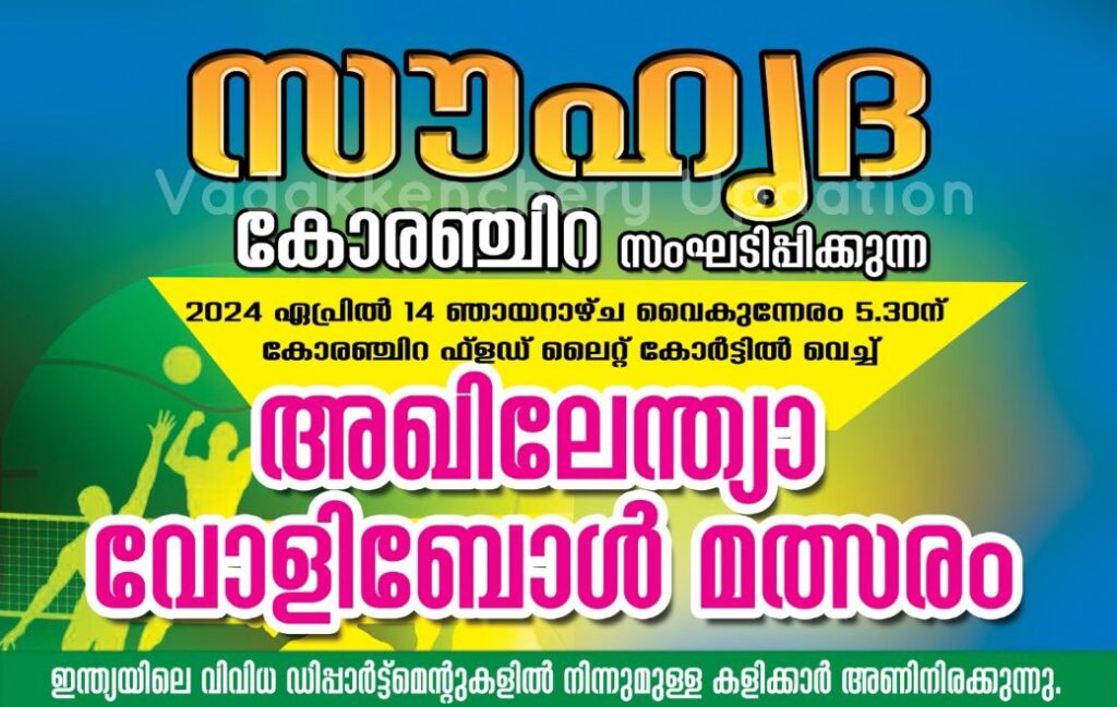 വടക്കേഞ്ചേരി കോരൻചിറ സൗഹൃദ സംഘടിപ്പിക്കുന്ന അഖിലേന്ത്യാ വോളിബോൾ മത്സരം നാളെ ഏപ്രിൽ 14 ഞായറാഴ്ച നടത്തുന്നു വൈകിട്ട് 5.30ന് ഗ്രാമപഞ്ചായത്ത് പ്രസിഡണ്ട് കവിത മാധവൻ ഉദ്ഘാടനം ചെയ്യും. രാജ്യത്തെ വിവിധ ഡിപ്പാർട്ട്മെൻ്റുകളിലെ ദേശീയ താരങ്ങളെ ഉൾപ്പെടുത്തിയാണ് വോളിബോൾ മത്സരങ്ങൾ സംഘടിപ്പിച്ചിരിക്കുന്നത്. കോരഞ്ചിറയിൽ പ്രത്യേകം സജ്ജീകരിച്ച ഫ്ലഡ് ലൈറ്റ് ഗ്രൗണ്ടിലാണ് മത്സരങ്ങൾ നടത്തുന്നത്. പ്രവേശനം സൗജന്യമാണ്