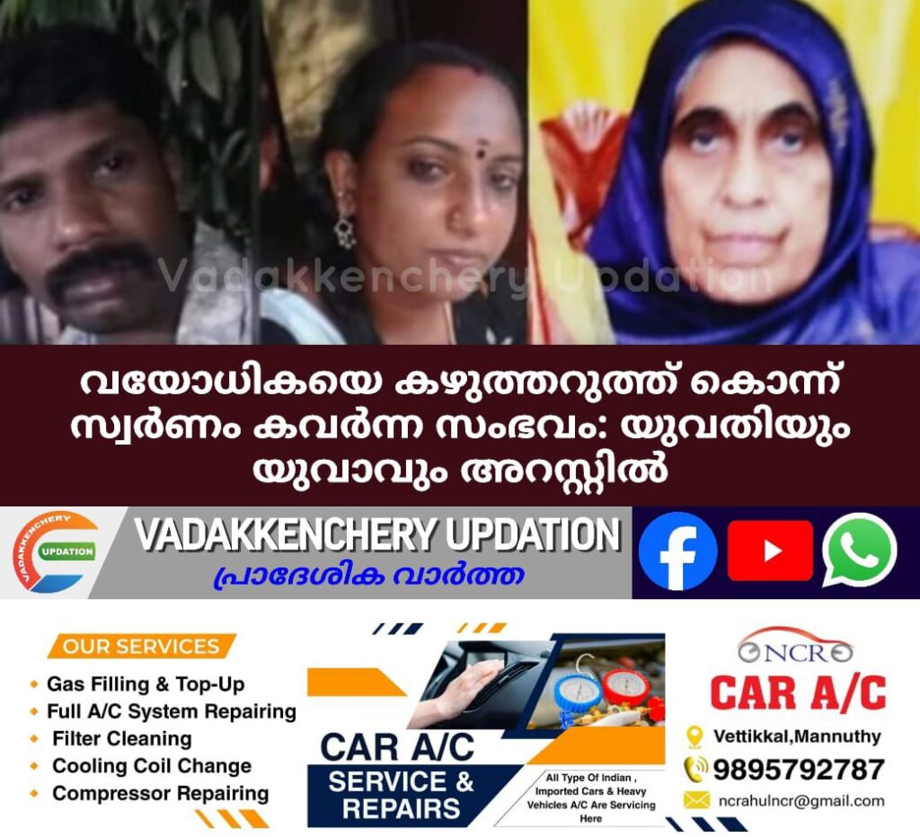 വീട്ടിൽ അതിക്രമിച്ചുകയറി വയോധികയെ കഴുത്തറുത്ത് കൊലപ്പെടുത്തി സ്വർണാഭരണങ്ങൾ കവർന്ന സംഭവത്തിൽ യുവതിയെയും യുവാവിനെയും അടിമാലി പൊലീസ് അറസ്റ്റ് ചെയ്തു. കൊല്ലം കിളികൊല്ലൂർ എം.ജി നഗറിൽ സേവ്യർ ക്വാർട്ടേഴ്സിൽ അലക്സ് യേശുദാസൻ (35), കൊല്ലം ഡീസന്റുമുക്ക് കല്ലുവിള കുന്നേൽ കവിത സുകേഷ് (36) എന്നിവരെയാണ് പാലക്കാട് ജില്ലയിലെ കുഴൽമന്ദത്ത് ബസിൽ സഞ്ചരിക്കുന്നതിനിടെ പിടികൂടിയത്.