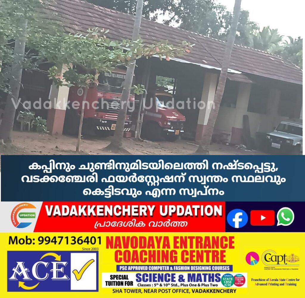 രണ്ടര പതിറ്റാണ്ടിലേറെയായി വാടക കെട്ടിടത്തില് പ്രവർത്തിച്ചുവരുന്ന വടക്കഞ്ചേരി ഫയർ സ്റ്റേഷന് സ്വന്തമായി സ്ഥലവും കെട്ടിടവും എന്ന സ്വപ്നം ഇനിയും യാഥാർഥ്യമായില്ല. വടക്കഞ്ചേരിയില് കെഎസ്ആർടിസി ഡിപ്പോ കോമ്പൗണ്ടില് സ്ഥലം അനുവദിക്കാനുള്ള നടപടികള് അവസാന റൗണ്ടിലെത്തിയിരുന്നെങ്കിലും ഒടുവില് എല്ലാം കൈവിടുകയായിരുന്നു.
