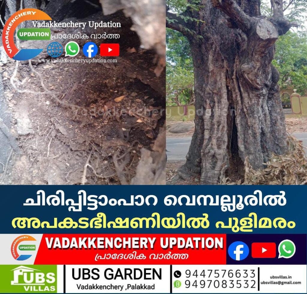 പുളിമരത്തിന്റെ അടിഭാഗം ദ്രവിച്ച നിലയിലാണ് റോഡരികിൽ നിൽക്കുന്നത് ഒരു കാറ്റടിച്ചാൽ വീഴാവുന്ന സാഹചര്യമാണ് നിലവിൽ ഉള്ളത് അധികാരികളോട് എത്രയും പെട്ടെന്ന് മുറിച്ചു മാറ്റണമെന്ന് നാട്ടുകാർ ആവശ്യം അല്ലാത്തപക്ഷം വൻ നാശനഷ്ടങ്ങൾ ഉണ്ടാവാൻ സാധ്യതയുണ്ട്. കൊടുവായൂർ – ആലത്തൂർ പൊള്ളാച്ചിയിലേക്കുള്ള പ്രധാന റോഡാണ് ഇത് .സ്കൂൾ, പോസ്റ്റ് ഓഫീസ്, റേഷൻ കട ,കള്ള് ഷാപ്പ് എന്നീ സ്ഥാപനങ്ങൾ സമീപത്തുണ്ട് ഇവിടെയ്ക്ക് നിരവിധി ആളുകൾ നടന്നും പോകാറുണ്ട് .ഇതിനുമുമ്പും ഇതിനെക്കുറിച്ച് പല വാർത്തകളും നൽകിയതാണ് എന്നാൽ ഒരു നടപടിയും ഇതുവരെ സ്വീകരിച്ചിട്ടില്ല