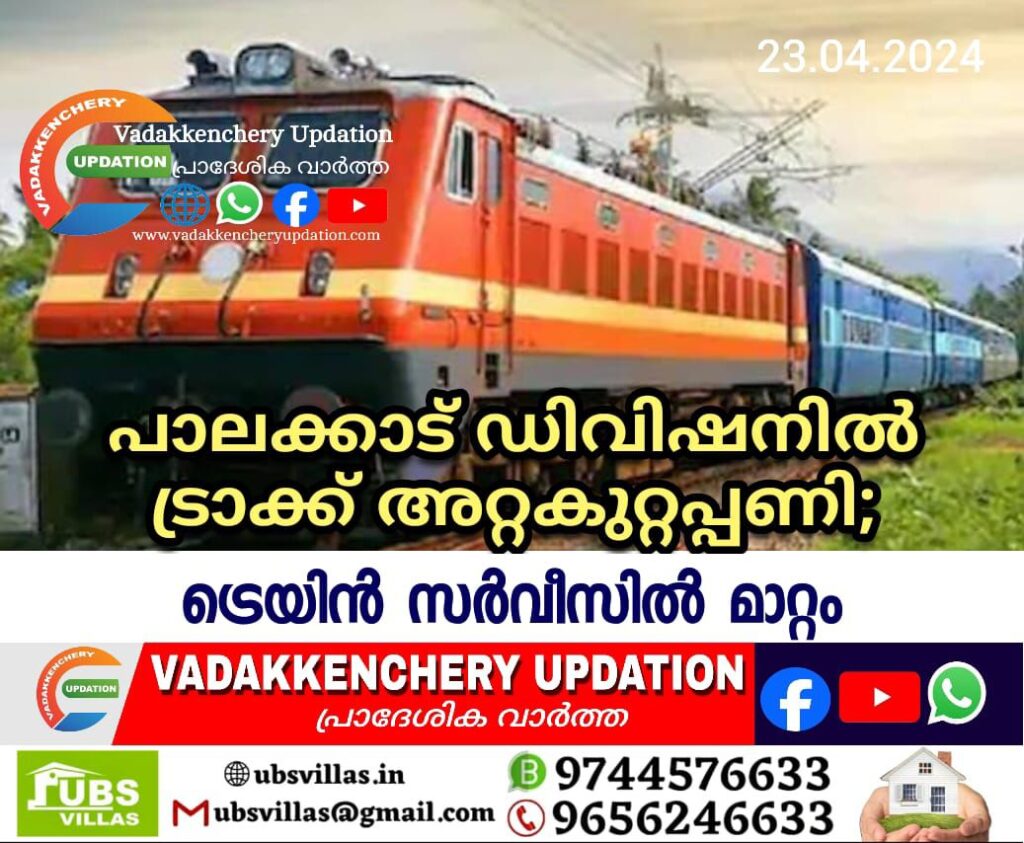 പാലക്കാട് ഡിവിഷനു കീഴിലെ വിവിധയിടങ്ങളിൽ ട്രാക്ക് അറ്റകുറ്റപ്പണി നടക്കുന്നതിനാൽ ചില ട്രെയിൻ സർവീസുകളിൽ മാറ്റം.