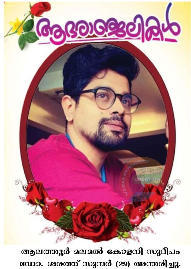ആലത്തൂർ മലമൽ കോളനി സുദീപം ഡോ. ശരത്ത് സുന്ദർ (29) അന്തരിച്ചു. സംസ്കാരം ഇന്ന് (03.05.2024- വെള്ളി) 10 മണിക്ക് ശേഷം തിരുവില്വാമല ഐവർ മഠത്തിൽ