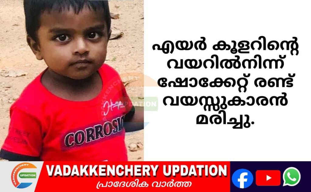എളനാട് മുളക്കാട് കോലത്ത് വീട്ടിൽ എൽദോസിൻ്റെ മകൻ ഏദനാണ് മരിച്ചത്.ശനിയാഴ്ച പകൽ 2.30 ഓടുകൂടി ഏദൻ്റെ അമ്മ ആഷ്ലിയുടെ വടക്കഞ്ചേരി കണക്കൻതുരുത്തിയിലെ വീട്ടിൽ വച്ചാണ് അപകടം സംഭവിച്ചത്.അമ്മ വീട്ടിൽ വിരുന്നിന് വന്ന എദൻ എയർ കൂളറിൻ്റെ വയറിൽ പിടിച്ചപ്പോൾ അബദ്ധത്തിൽ ഷോക്കേല്ക്കുകയായിരുന്നു. ഉടൻ തന്നെ തൃശൂരിലെ സ്വകാര്യ ആശുപത്രിയിൽ എത്തിച്ചെങ്കിലും മരിച്ചു. വടക്കഞ്ചേരി പൊലീസ് കേസെടുത്തു.