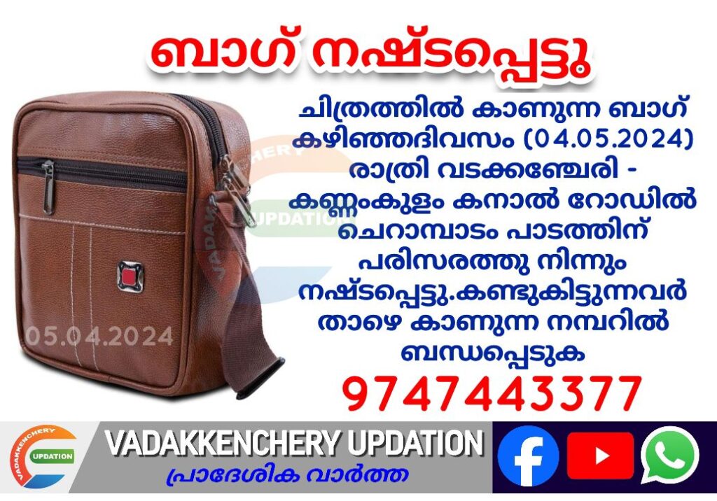 ചിത്രത്തിൽ കാണുന്ന ബാഗ് കഴിഞ്ഞദിവസം (04.05.2024) രാത്രി വടക്കഞ്ചേരി – കണ്ണംകുളം കനാൽ റോഡിൽ ചെറാമ്പാടം പാടത്തിന് പരിസരത്തു നിന്നും നഷ്ടപ്പെട്ടു.