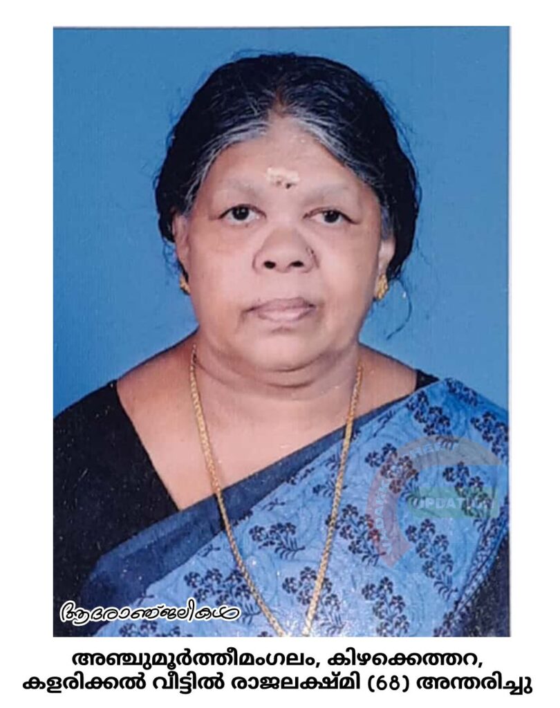 അഞ്ചുമൂർത്തീമംഗലം, കിഴക്കെത്തറ, കളരിക്കൽ വീട്ടിൽ പരേതനായ രാജൻ പണിക്കർ ഭാര്യ രാജലക്ഷ്മി (68) അന്തരിച്ചു.