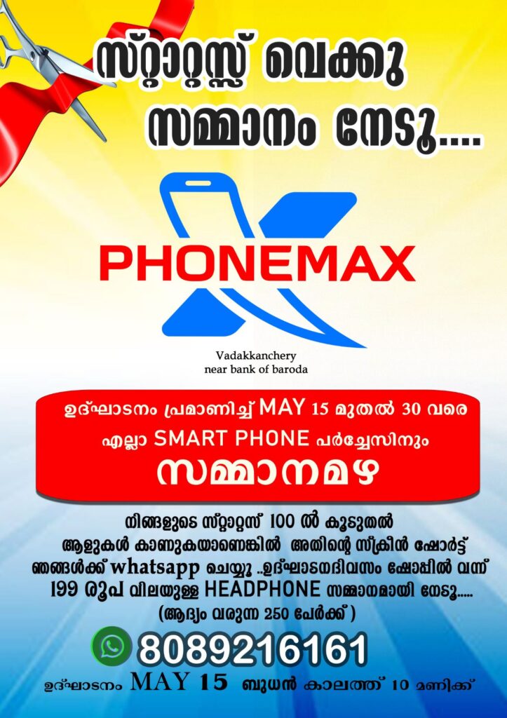 പ്രിയപ്പെട്ടവരെ കഴിഞ്ഞ 10 വർഷങ്ങളായി മൊബൈൽ വിപണന,സർവീസ് രംഗത്ത് മികച്ച സേവനം നടത്തിവരുന്ന ഞങ്ങളുടെ നാലാമത് shoroom Phonmax എന്ന പേരിൽ ഈ വരുന്ന മെയ് 15 കാലത്ത് 10.00 മണിക്ക് വടക്കഞ്ചേരിയിൽ ഉദ്ഘാടനം ചെയ്യുന്നു… ഉദ്ഘാടനവേളയിലും തുടർന്നും നിങ്ങളേവരുടെയും പ്രാർത്ഥനയും സഹകരണവും ഉണ്ടാവണമെന്ന് വിനീതമായി അഭ്യർത്ഥിക്കുന്നു…. എന്ന് Team Phonemax