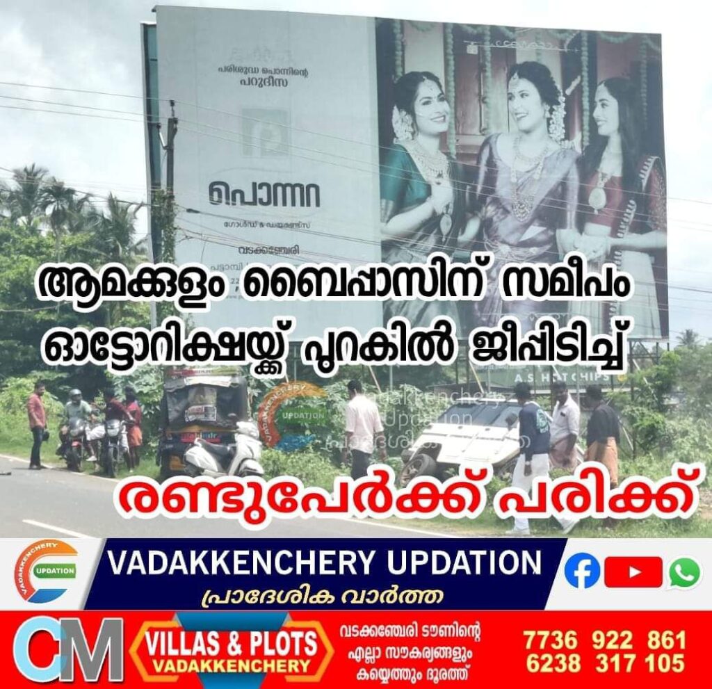 വടക്കഞ്ചേരി മംഗലം ഗോവിന്ദാപുരം സംസ്ഥാനപാതയിൽ ആമക്കുളം ബൈപ്പാസിന് സമീപം ഓട്ടോറിക്ഷയ്ക്ക് പുറകിൽ ബൊലേറോ ജീപ്പിടിച്ച് രണ്ടുപേർക്ക് പരിക്കേറ്റു.ഓട്ടോറിക്ഷയിലെ യാത്രക്കാരായ ഡ്രൈവർ കിഴക്കഞ്ചേരി മമ്പാട് സ്വദേശി ഷംസുദ്ദീൻ (53) ഇവരുടെ ബന്ധു കിഴക്കഞ്ചേരി സ്വദേശിനി ഷാജിത (45)എന്നിവർക്കാണ് പരിക്കേറ്റത്.