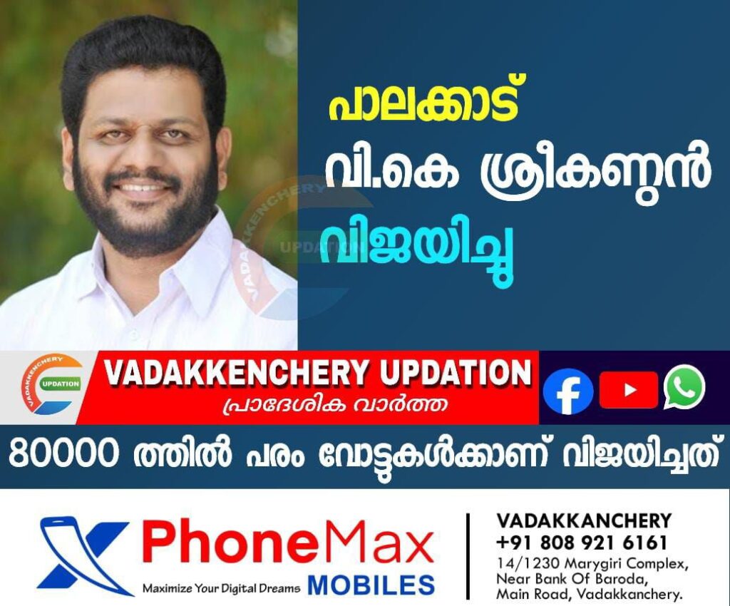സിപിഐഎം സ്ഥാനാര്ഥി എ വിജയരാഘവനെ പാരജയപ്പെടുത്തിയാണ് യുഡിഎഫിലെ സിറ്റിങ്ങ് എംപി കുടിയായ ശ്രീകണ്ഠന് മണ്ഡലം നിലനിര്ത്തിയത്. ബിജെപി സ്ഥാനാര്ഥി സി കൃഷ്ണകുമാറാണ് മൂന്നാം സ്ഥാനത്ത്.