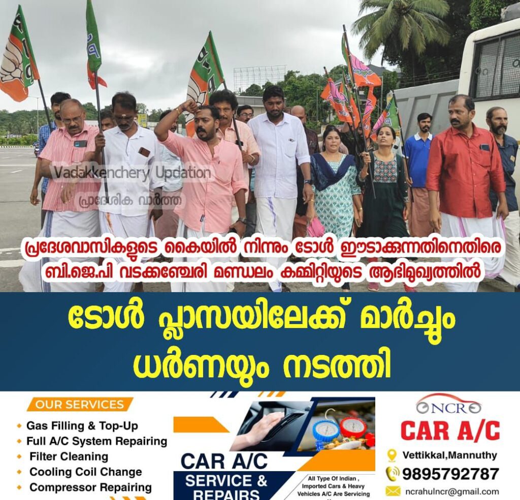 ബി.ജെ.പി വടക്കഞ്ചേരി മണ്ഡലം കമ്മിറ്റിയുടെ ആഭിമുഖ്യത്തിൽ ടോൾ പ്ലാസയിലേക്ക് മാർച്ചും ധർണയും നടത്തി മണ്ഡലം ജനറൽ സെക്രട്ടറി അഡ്വ. ശ്രീരാജ് വള്ളിയോട് അദ്ധ്യക്ഷനായി. ജില്ലാ കമ്മിറ്റി അംഗം ജോമോൻ ചക്കാലക്കൽ ഉദ്ഘാടനം ചെയ്തു. ജില്ലാ കമ്മിറ്റി അംഗം വി.ശ്രീകണ്ഠൻ, കെ.കൃഷ്ണകുമാർ , സി.കെ അജിത് ഡി. ധനിത, എം മഞ്ജുഷ , ആർ രമണി, പി.കെ ഗുരു തുടങ്ങിയവർ സംസാരിച്ചു .