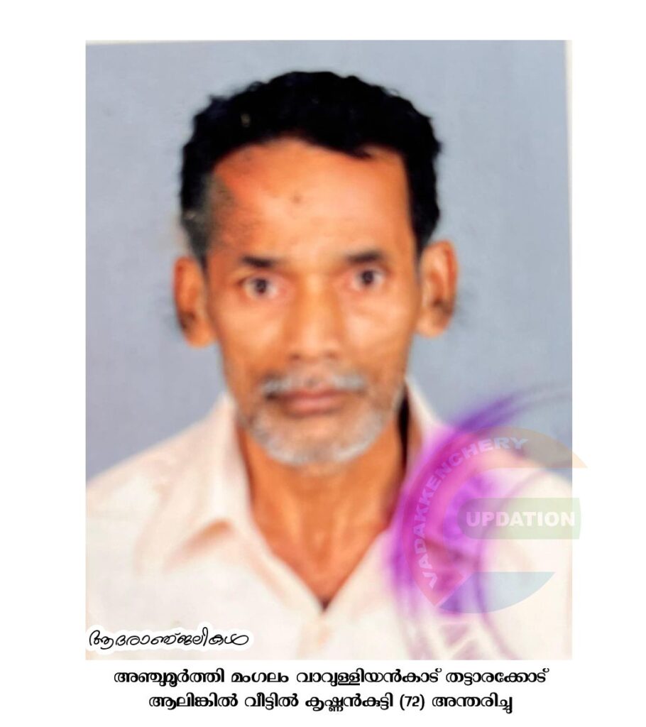 അഞ്ചുമൂർത്തി മംഗലം വാവുള്ളിയൻകാട് തട്ടാരക്കോട് ആലിങ്കിൽ വീട്ടിൽ പരേതനായ തെയ്യൻ മകൻ കൃഷ്ണൻകുട്ടി (72) അന്തരിച്ചു