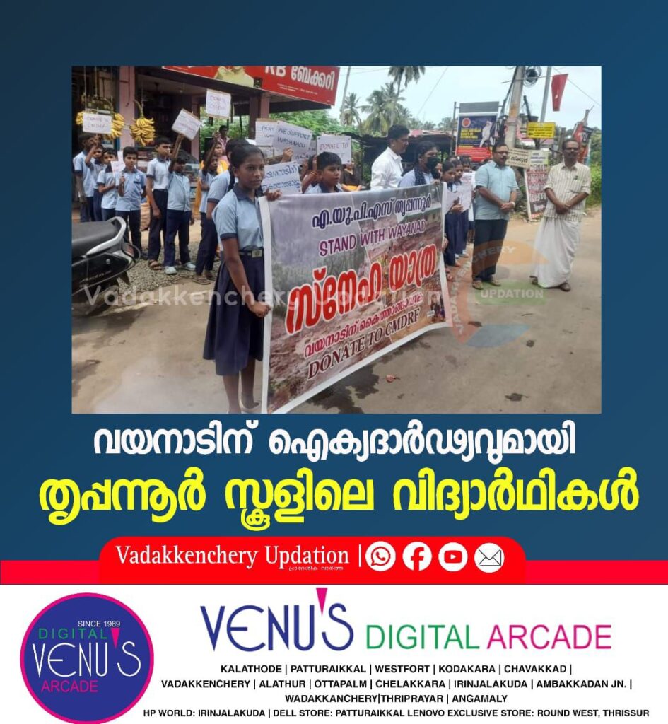 വയനാട് ദുരന്തത്തിനിരയായവർക്ക് ഐക്യദാർഢ്യം പ്രകടിപ്പിച്ചും മുഖ്യമന്ത്രിയുടെ ദുരിതാശ്വാസനിധി വിജയിപ്പിക്കണമെന്ന് ആഹ്വാനംചെയ്തും തൃപ്പന്നൂർ എ.യു.പി.സ്കൂളിലെ സാമൂഹ്യശാസ്ത്രക്ലബിൻ്റെ നേതൃത്വത്തിൽ സ്നേഹയാത്ര എന്ന പേരിൽ പദയാത്ര സംഘടിപ്പിച്ചു. പ്രധാനാധ്യാപകൻ ബിജു.എം.അബ്രഹാമിൻ്റെ അധ്യക്ഷതയിൽ കുണ്ടുകാട് ടൗണിൽ പദയാത്ര കിഴക്കഞ്ചേരി പഞ്ചായത്ത് വൈസ് പ്രസിഡൻ്റ് വി.രാധാകൃഷ്ണൻ ഉദ്ഘാടനം ചെയ്തു .CMDRF നെതിരെ ചിലകേന്ദ്രങ്ങളിൽനിന്ന് കുപ്രചരണങ്ങൾ ഉണ്ടാകുമ്പോൾ അത് വിജയിപ്പിക്കാൻ വിദ്യാർഥികൾ രംഗത്ത് വരുന്നത് അഭിനന്ദനാർഹമാണെന്ന് അദ്ദേഹം പറഞ്ഞു .