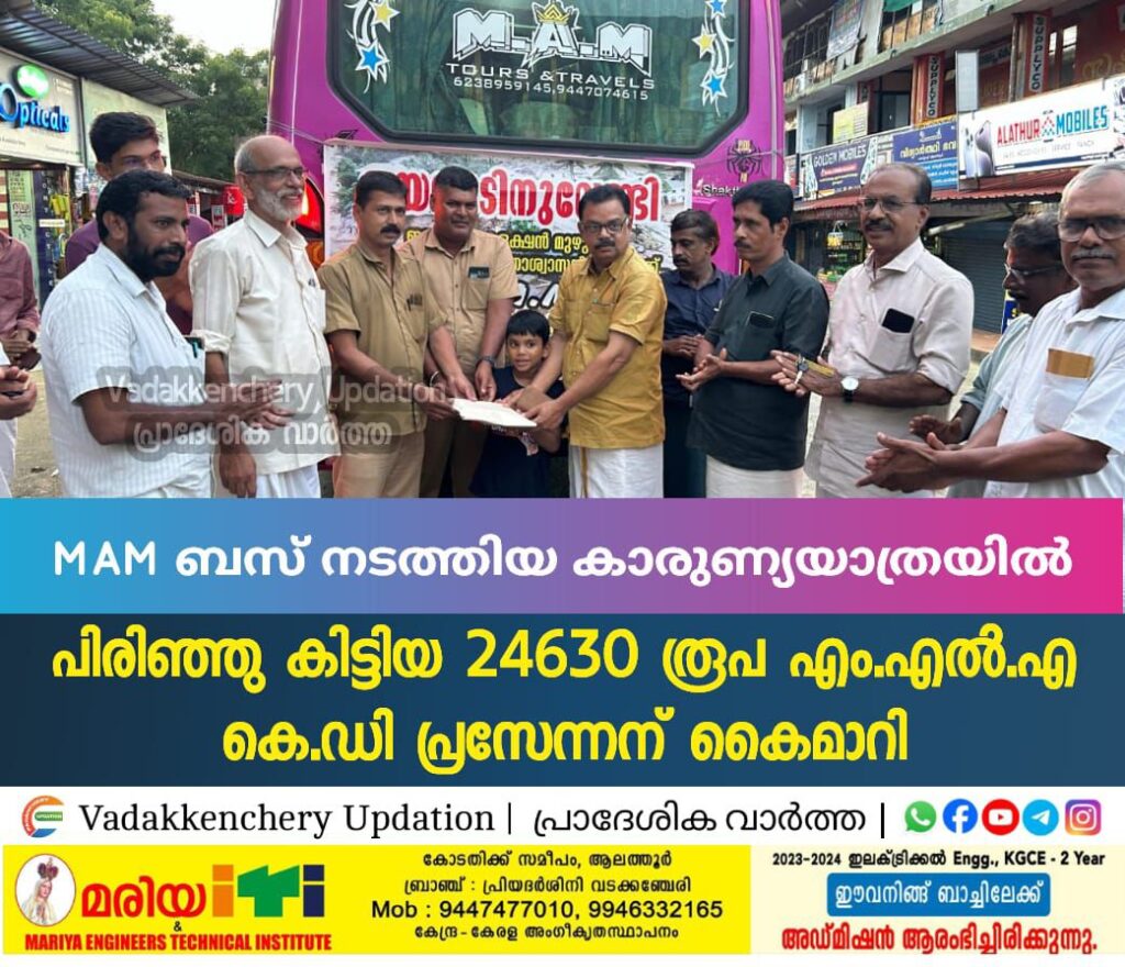 തൃശൂർ പാലക്കാട് റൂട്ടിൽ ഓടുന്ന MAM ബസ് നടത്തിയ കാരുണ്യയാത്രയിൽ പിരിഞ്ഞു കിട്ടിയ 24630 രൂപ ആലത്തൂർ എം.എൽ. എ കെ.ഡി പ്രസേന്നന് കൈമാറി ഇന്ന് രാവിലെ മുതൽ തൃശൂർ പാലക്കാട് റൂട്ടിൽ ഓടുന്ന MAM ബസിൻ്റെ ഒരു ദിവസത്തെ കളക്ഷൻ വയനാട് ഉരുൾപൊട്ടൽ ദുരന്തത്തിൽപെട്ടവർക്കായുള്ള മുഖ്യമന്ത്രിയുടെ ദുരിതാശ്വാസ നിധിയിലേക്ക് നൽകി