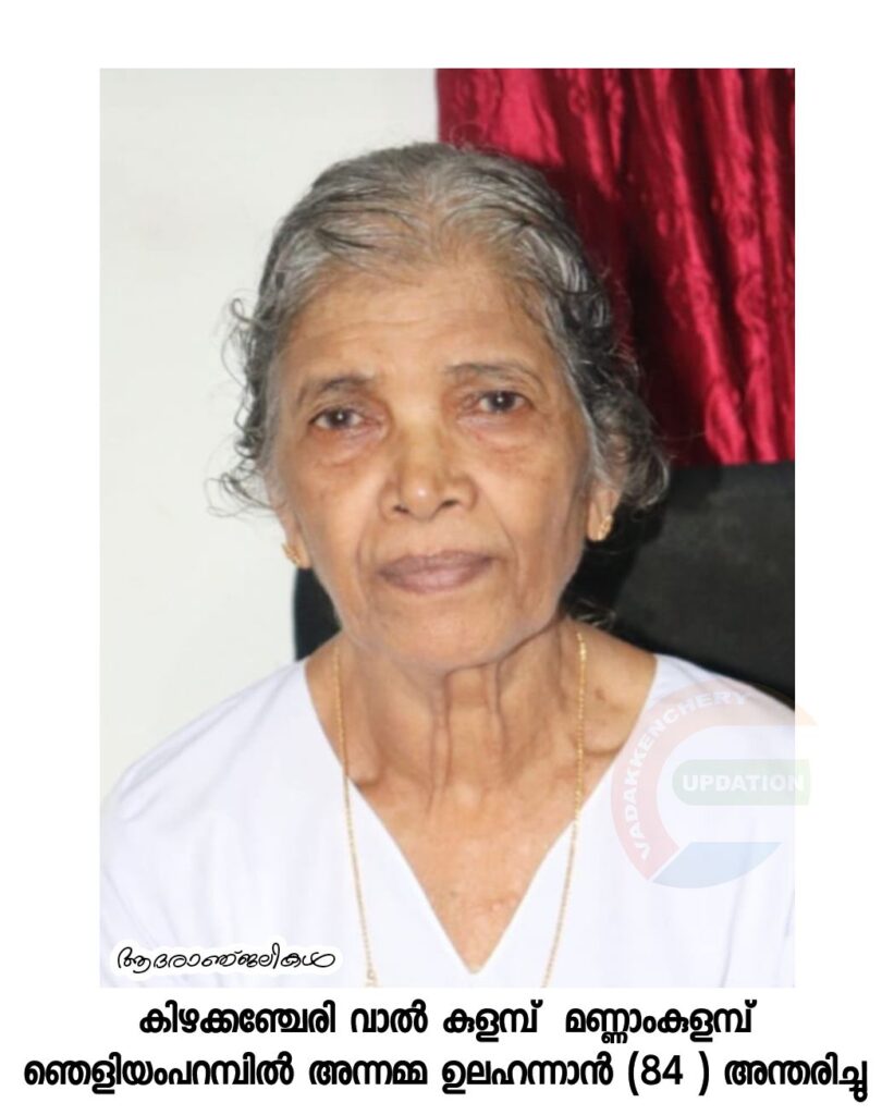 വടക്കഞ്ചേരി കിഴക്കഞ്ചേരി വാൽ കുളമ്പ് മണ്ണാംകുളമ്പ് ഞെളിയംപറമ്പിൽ അന്നമ്മ ഉലഹന്നാൻ (84) അന്തരിച്ചു കേതമംഗലം ചെട്ടിയാം കുടിയിൽ കുടുംബാംഗമാണ്