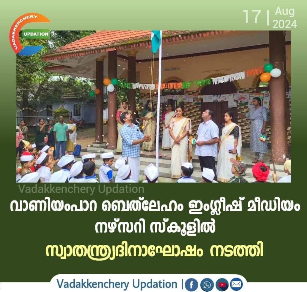 വാണിയംപാറ ബെത് ലേഹം ഇംഗ്ലീഷ് മീഡിയം നഴ്സറി സ്കൂളിൽ സ്വാതന്ത്ര്യദിനാഘോഷം വിവിധ പരിപാടികളോടെ നടത്തി. പിടിഎ പ്രസിഡന്റ് രാഹുൽ എൻ സി പതാക ഉയർത്തി തുടർന്ന് സ്കൂൾ മാനേജർ സജി എം ജോർജ് പ്രസംഗിച്ചു. എം പി ടി എ പ്രസിഡൻറ് ലൈജി ബാബു സ്വാതന്ത്രദിന സന്ദേശം നൽകി.