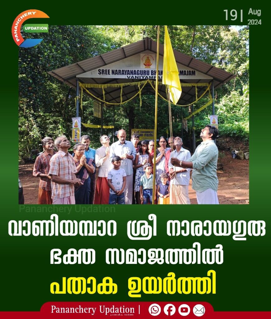 170-ാം മത് ശ്രീനാരായണഗുരു ജയന്തി ആഘോഷത്തിൻ്റെ ഭാഗമായി വാണിയംപാറ എസ് എൻ നഗറിൽ ഗുരു മന്ദിരത്തിൽ സമാജം സെക്രട്ടറി എൻ.സി രാഹുൽ പതാക ഉയർത്തി എക്സിക്യൂട്ടീവ് അംഗങ്ങളും ബാലസമാജം, മാതൃ സമാജം ഭാരവാഹികളും പങ്കെടുത്തു. ശ്രീ നാരായണഗുരു ജയന്തി ദിനത്തിൽ സമാജം മന്ദിരത്തിൽ കാലത്ത് 9 മണി മുതൽ പ്രാർത്ഥന ഉണ്ടായിരിക്കും 12 മണി മുതൽ പ്രസാദ ഊട്ടും ഉണ്ടായിരിക്കും . ഗുരു പൂജയ്ക്കും തുടർന്നുള്ള പരിപാടികളിലേക്ക് ഏവരെയും സ്വാഗതം ചെയ്യുന്നതായി കമ്മറ്റി ഭാരവാഹികൾ അറിയിച്ചു