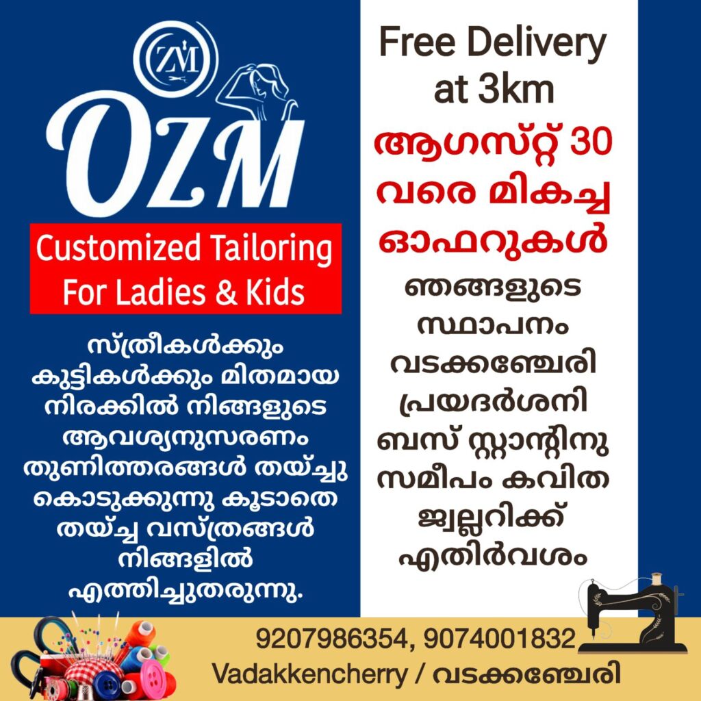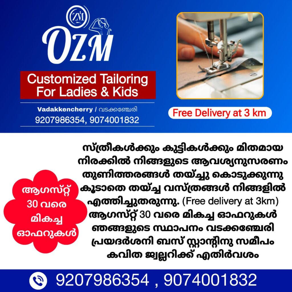 സ്ത്രീകൾക്കും കുട്ടികൾക്കും മിതമായ നിരക്കിൽ നിങ്ങളുടെ ആവശ്യനുസരണം തുണിത്തരങ്ങൾ തയ്ച്ചു കൊടുക്കുന്നു കൂടാതെ തയ്ച്ച വസ്ത്രങ്ങൾ നിങ്ങളിൽ എത്തിച്ചുതരുന്നു. (Free delivery at 3km) ആഗസ്റ്റ് 30 വരെ മികച്ച ഓഫറുകൾ ഞങ്ങളുടെ സ്ഥാപനം വടക്കഞ്ചേരി പ്രയദർശനി ബസ് സ്റ്റാൻ്റിനു സമീപം കവിത ജ്വല്ലറിക്ക് എതിർവശം