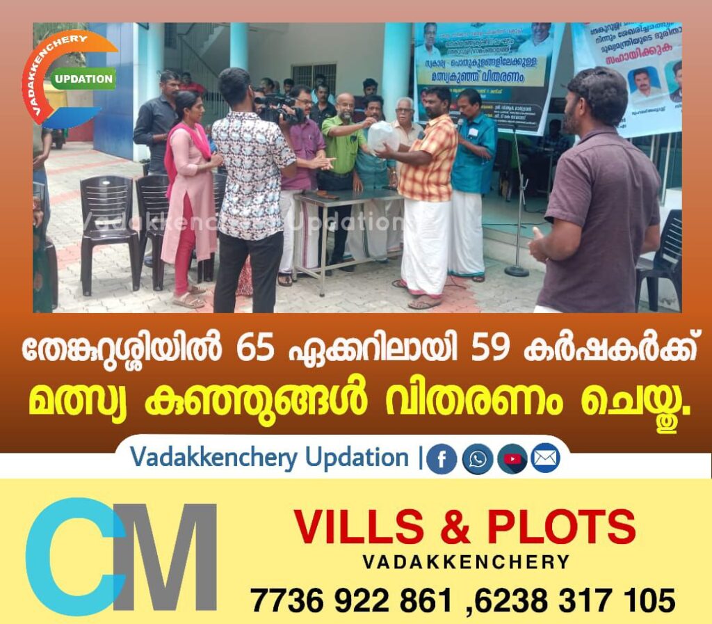 കേരള സർക്കാർ ഫിഷറീസ് വകുപ്പ് പഞ്ചായത്തുകളിലൂടെ നടപ്പിലാക്കി വരുന്ന പദ്ധതിയാണ് JMK അഥവ ജനകീയ മത്സ്യകൃഷി എന്ന പദ്ധതിയുടെ ഭാഗമായി തേങ്കുറുശ്ശിയിൽ 65 ഏക്കറിലായി 59 കർഷകർക്ക് ഈ വർഷത്തേക്കുള്ള മത്സ്യകുഞ്ഞുങ്ങളുടെ വിതരണം പഞ്ചായത്ത് ഹാളിൽ വെച്ച് ആലത്തൂർ എംഎൽഎ കെ.ഡി പ്രസേനൻ ഉദ്ഘാടനം നിർവ്വഹിച്ചു.